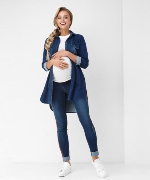 Рубашка из плотной джинсы с лампасами в боковых швах. Подойдет для беременных и кормящих мам и сделает ваш образ современным. Для кормления — незаметные молнии в рельефах. В комплекте пояс.