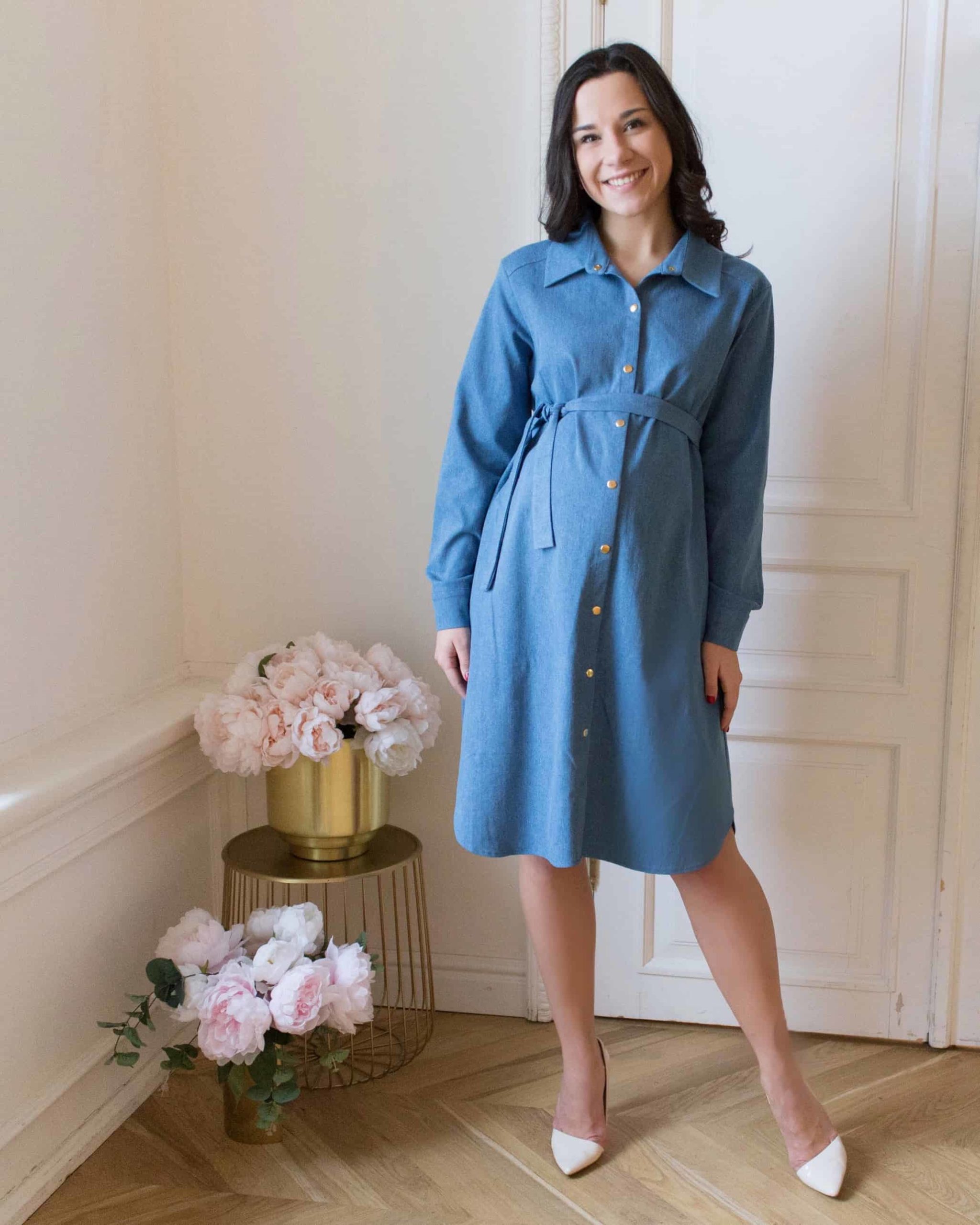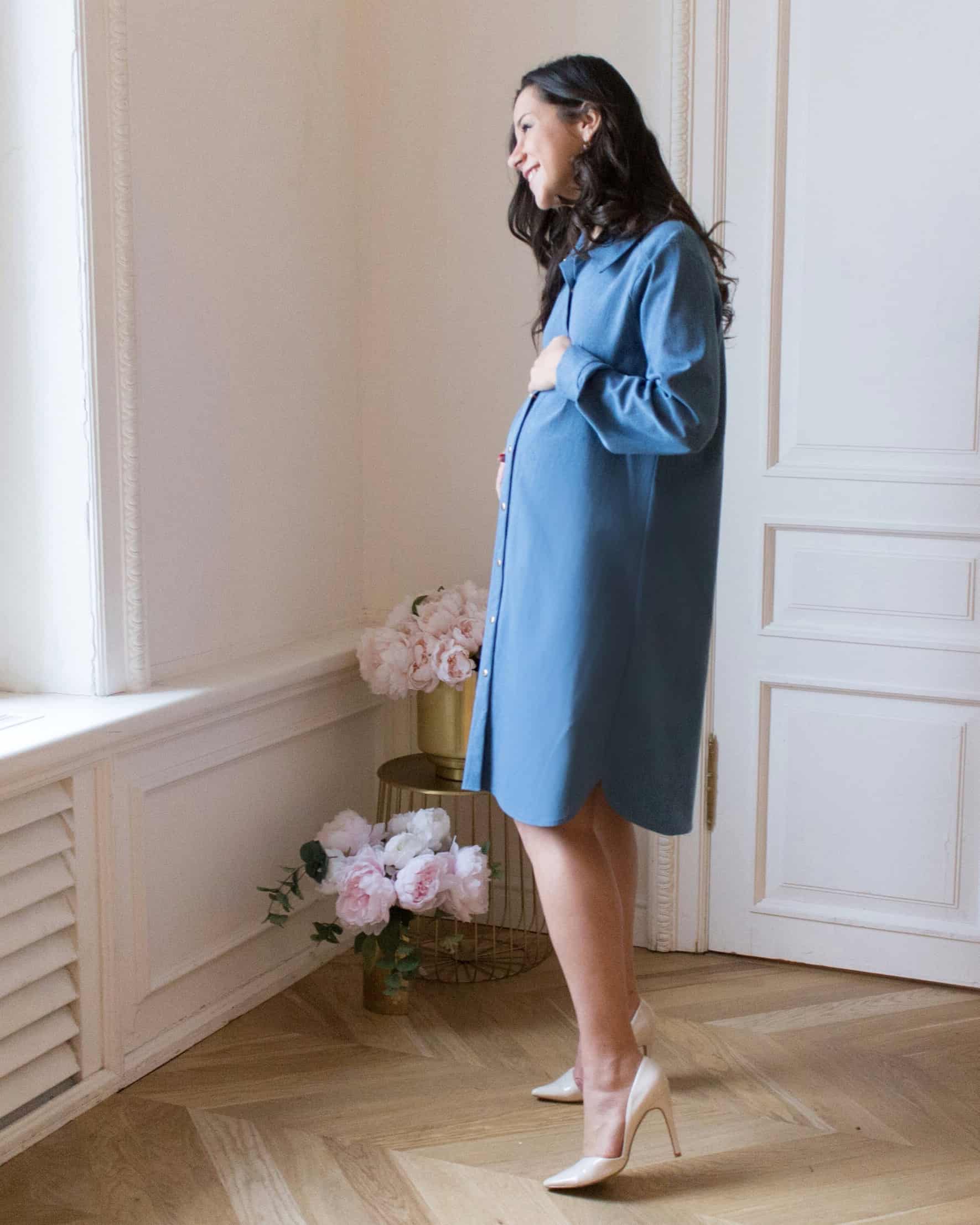 Платье-рубашка модного джинсового стиля, специально сконструированное под растущий животик. Пояс можно носить под грудью или на талии, после беременности. Платье декорировано золотыми кнопками.