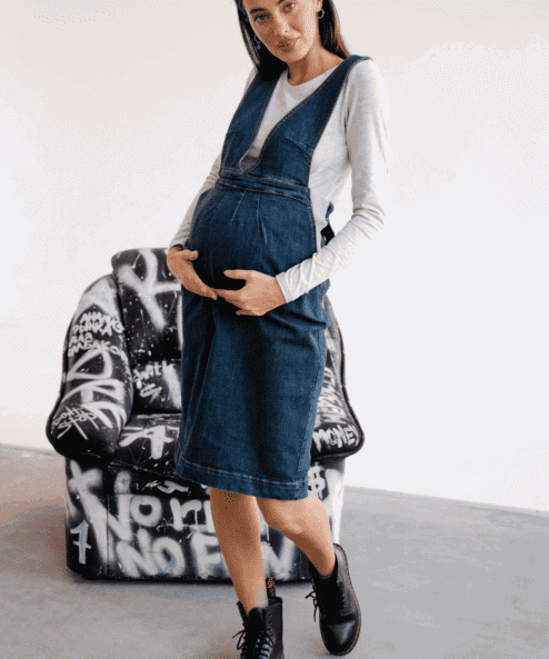 Джинсовый сарафан — отличное дополнение для базового гардероба. Свободный к низу силуэт не сковывает движения будущей мамы. Под грудью присутствуют вытачки, которые прекрасно подчеркивают округлившиеся формы, по бокам трикотажные вставки, которые позволяют носить модель на всех сроках беременности и после.