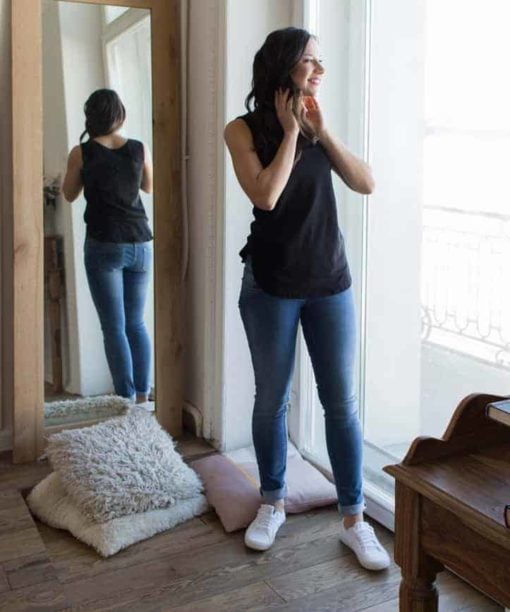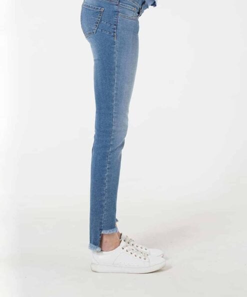 Джинсы скинни с высокой бандажной резинкой. 5 рабочих карманов. Особенность модели: передняя половинка брюк-короче, задняя-длиннее. Необработанный низ изделия. Отлично смотрятся как со спортивной обувью, так и с классической обувью ( лофферами, туфлями).