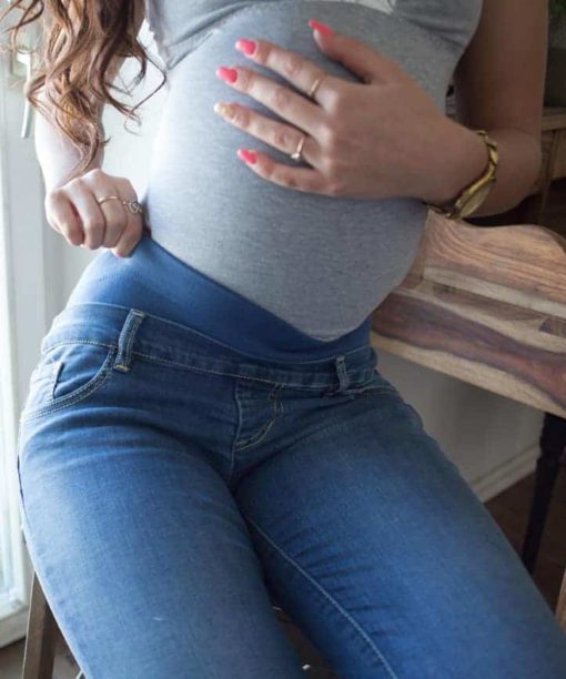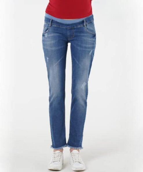 Джинсы-скини с потертостями и низкой бандажной резинкой. 5 рабочих карманов. На задних карманах-декоративная отстрочка. Особенность модели — необработанный низ.