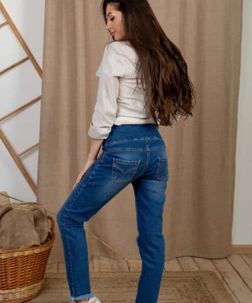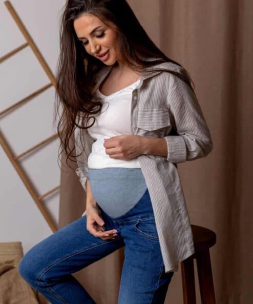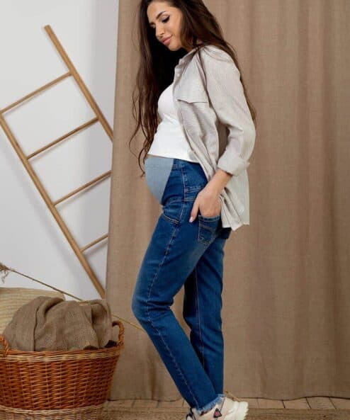 Стильные и удобные джинсы со специальной вставкой для растущего животика будущей мамы. Подобная конструкция позволяет обеспечить фирменную посадку moms-джинс. Они плотно садятся на талии и животике и более свободно в области бёдер. Изюминка джинсов — необработанный нижний край.