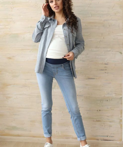 Джинсы-скини из светлой джинсы для беременных. Особенности: мягкая бандажная резинка спереди под живот, два прорезных кармана по бокам и два накладных сзади. Очень стильный вариант для будущих мам, станет вашим фаворитом этим летом и не только. Можно носить и после беременности.