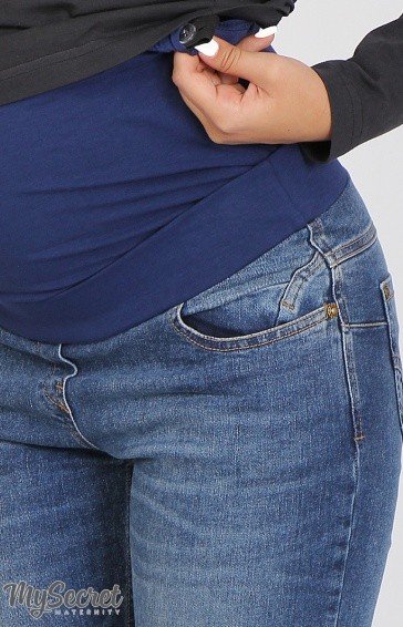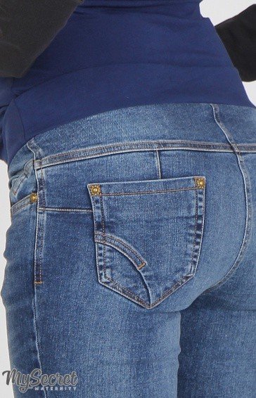 Прямые джинсы «Slim fit» из очень плотного стрейчевого денима. Классическая пятикарманная модель. Изюминка модели — декоративные подрезы на карманах на передней и задней части джинсов. Регулируемый высокий трикотажный пояс трикотажный бандажный пояс — такая комбинация позволяет носить джинсы после беременности (предварительно убрав высокий трикотажный пояс).