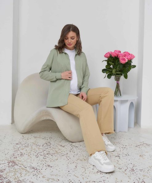 Стильная удлиненная рубашка для беременных и кормящих мам. Такую рубашку можно носить как с классическими брюками, так и с джинсами в стиле casual. Для кормления пуговицы расстегиваются.