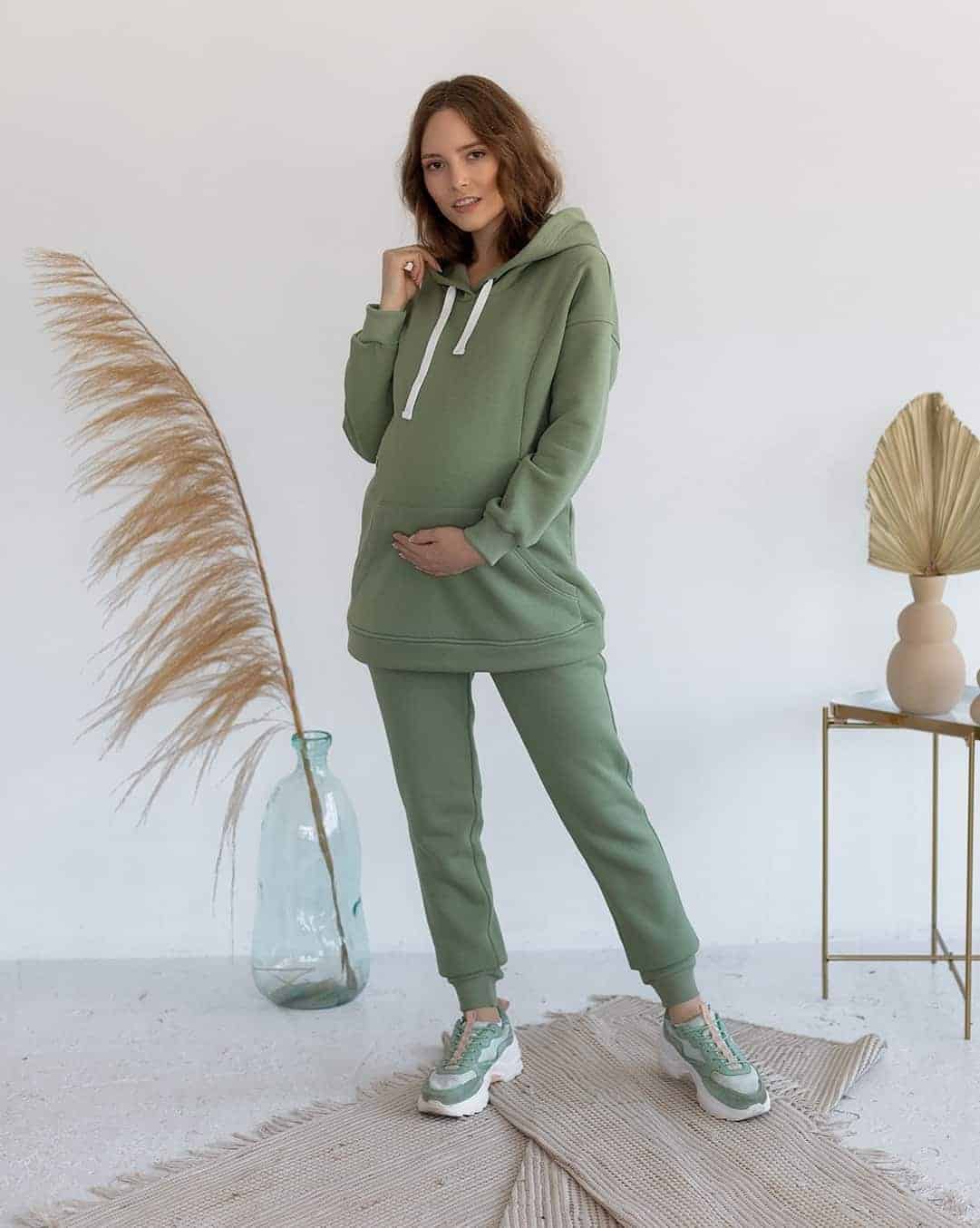 Брючки для будущих и кормящих мам из футера высшего качества «пенье» с начесом. Пояс брюк мягкий и эластичный, что позволяет носить их на любом сроке беременности и после. Бандажный пояс и отделка штанин выполнены из рибаны. В комплекте с брючками вы можете приобрести худи Sport