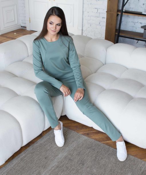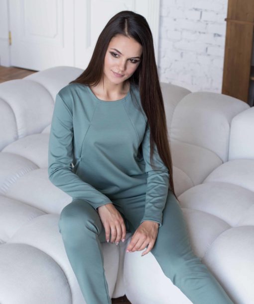 Свитшот для беременных и кормящих мам из приятного к телу материала. Он скроен специально для растущего животика и немного удлинен. Секрет кормления — потайные молнии в нагрудных рельефах свитшота. В комплекте можно приобрести брюки Smart.