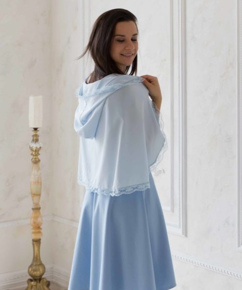 Элегантная накидка для мам, ценящих стиль и нежность в образе. Накидка поможет создать невероятно легкий и летящий образ, подчеркнув вашу женственность и изящество. Воздушность облику придает оборка, украшенная по краям великолепным кружевом.