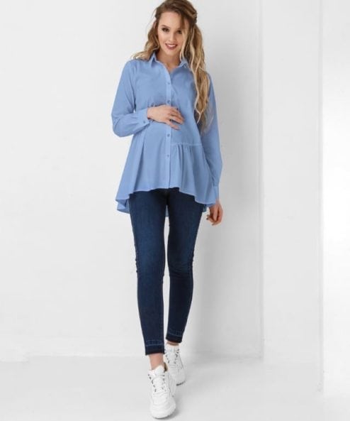 Хлопковая рубашка свободного кроя для беременных и кормящих мам. Такую рубашку можно носить как с классическими брюками, так и с джинсами в стиле casual. Для кормления нужно расстегнуть пуговицы.