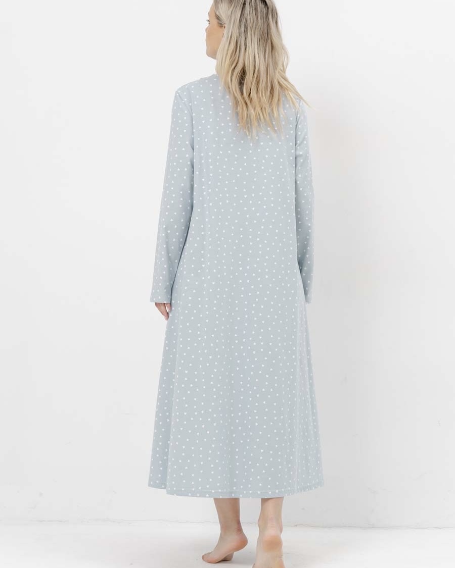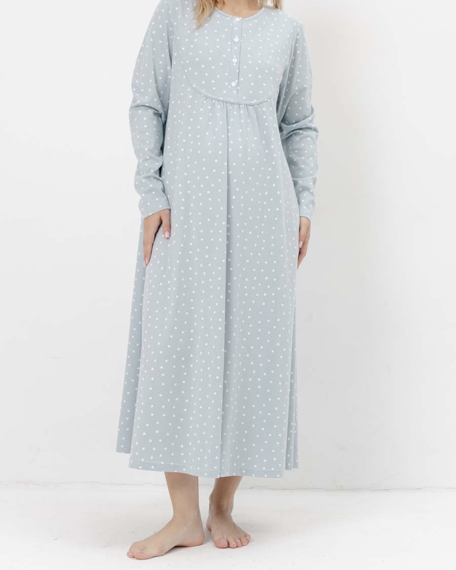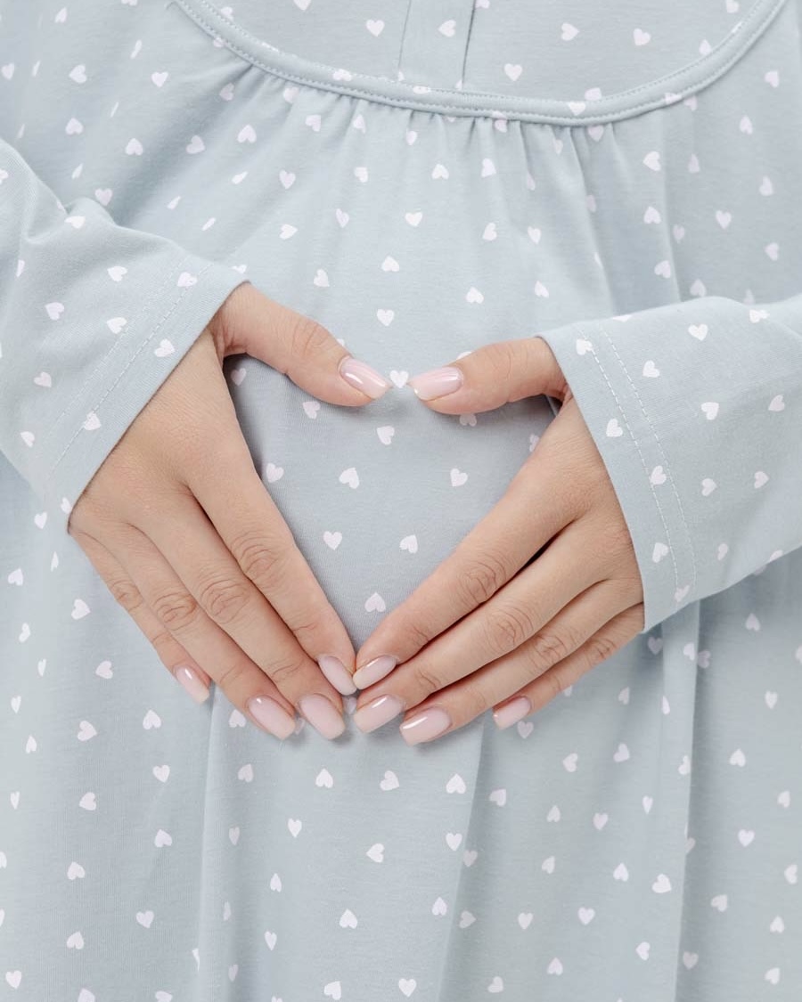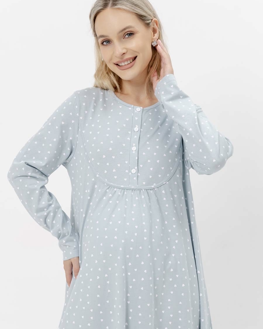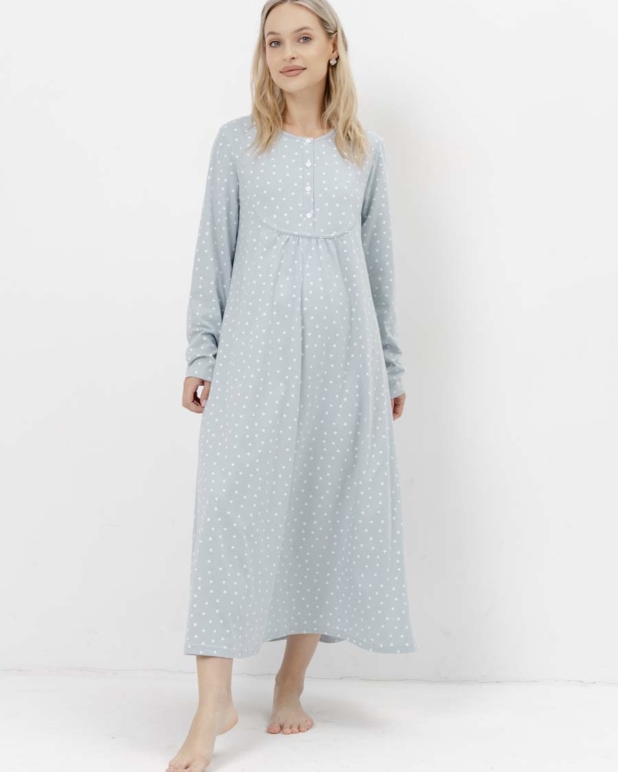 Уютная сорочка для беременных и кормящих женщин в длине макси. Выполнена из качественного хлопкового трикотажного полотна. Для кормления пуговицы расстегиваются.