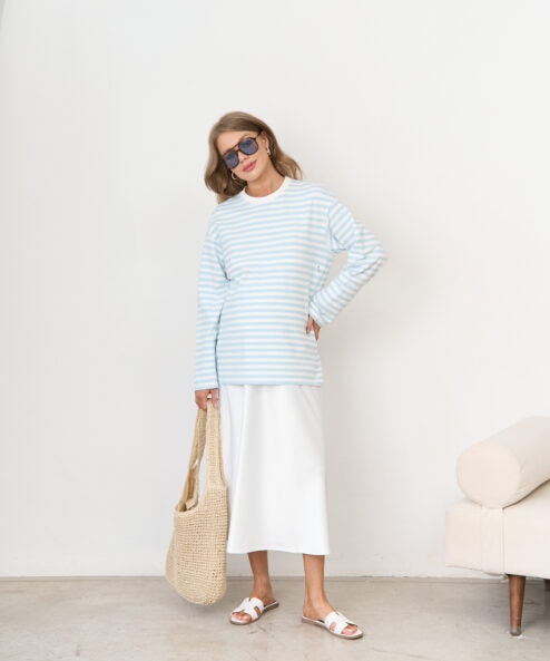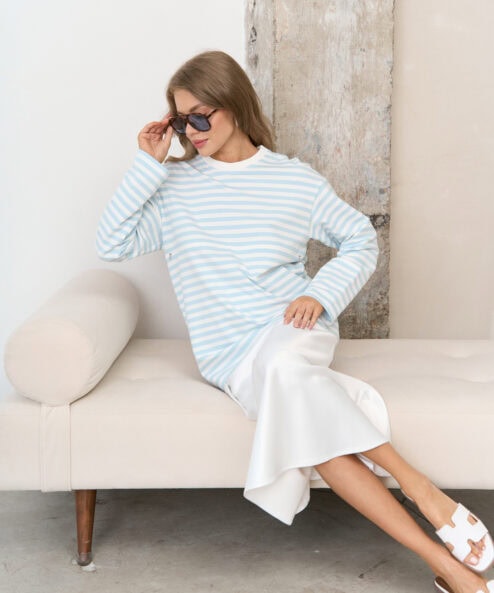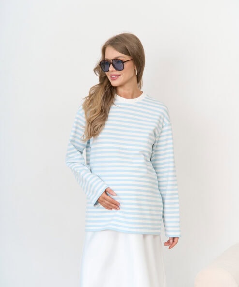 Актуальный лонгслив-тельняшка из трикотажной ткани, который подойдет на весь период беременности и после. Для кормления малыша — двухсторонняя горизонтальная молния.