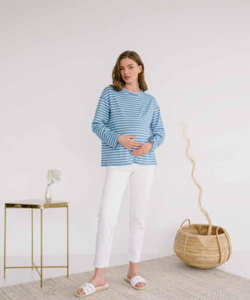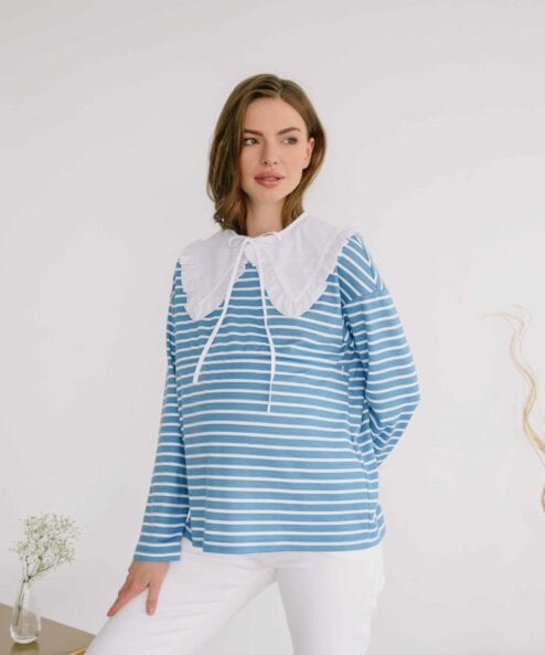 Актуальный лонгслив-тельняшка из трикотажной ткани, который подойдет на весь период беременности и после. Для кормления малыша — двухсторонняя горизонтальная молния.