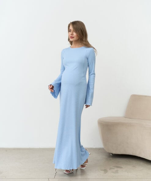 Трендовое трикотажное платье в длине макси из мягкой вискозной пряжи. Специальные завязки позволят регулировать объем и носить всю беременность и после.