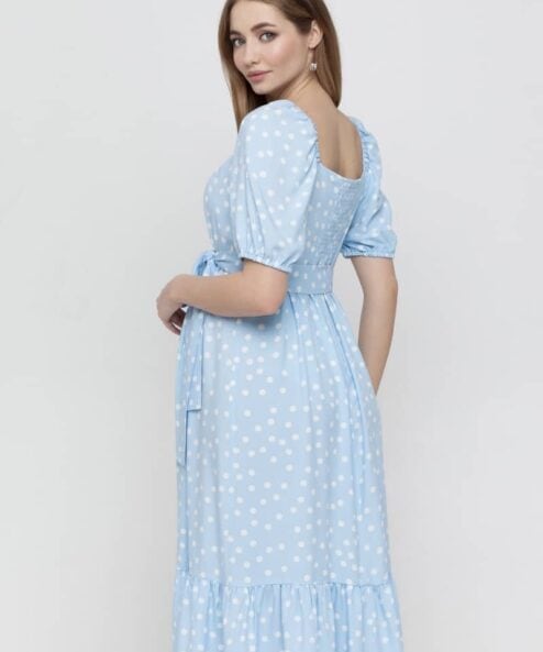 Платье для беременных и кормящих с акцентными рукавами-буфами и разрезом.
