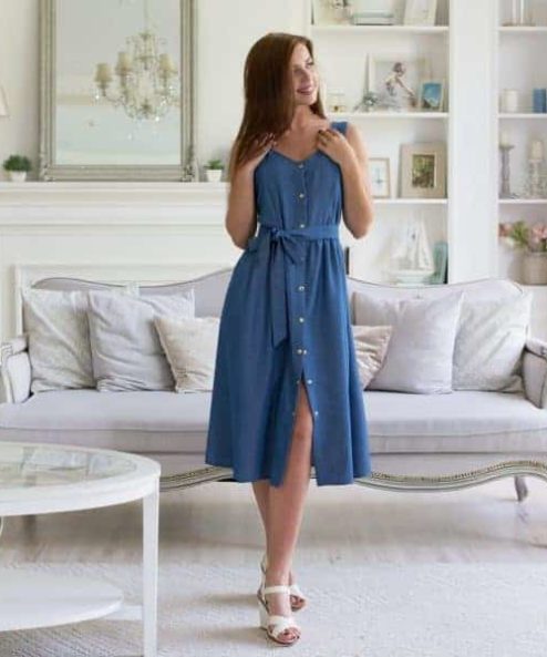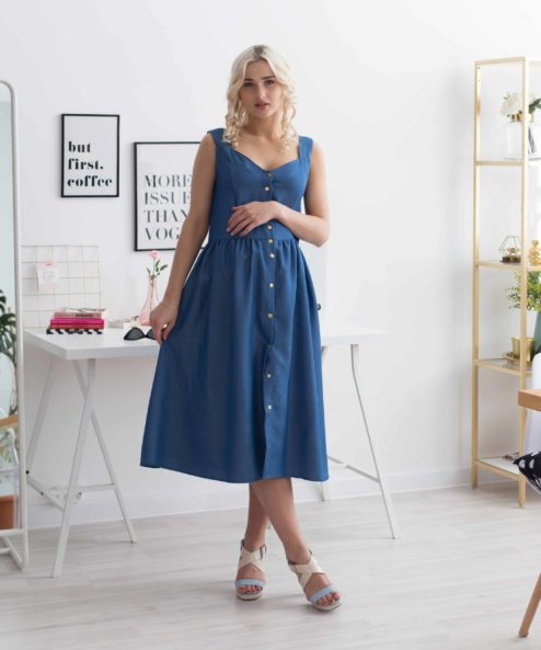 Сарафан модного джинсового стиля длины миди с контрастными золотыми кнопками. Крой изделия идеально подойдет кормящей маме, а также на период беременности (до 7 месяца). Для кормления предусмотрены незаметные молнии в топе. В комплекте пояс. Легкая нежарка ткань — прекрасный вариант на лето, можно создавать множество разных образов, носить платье с кедами либо с туфлями.