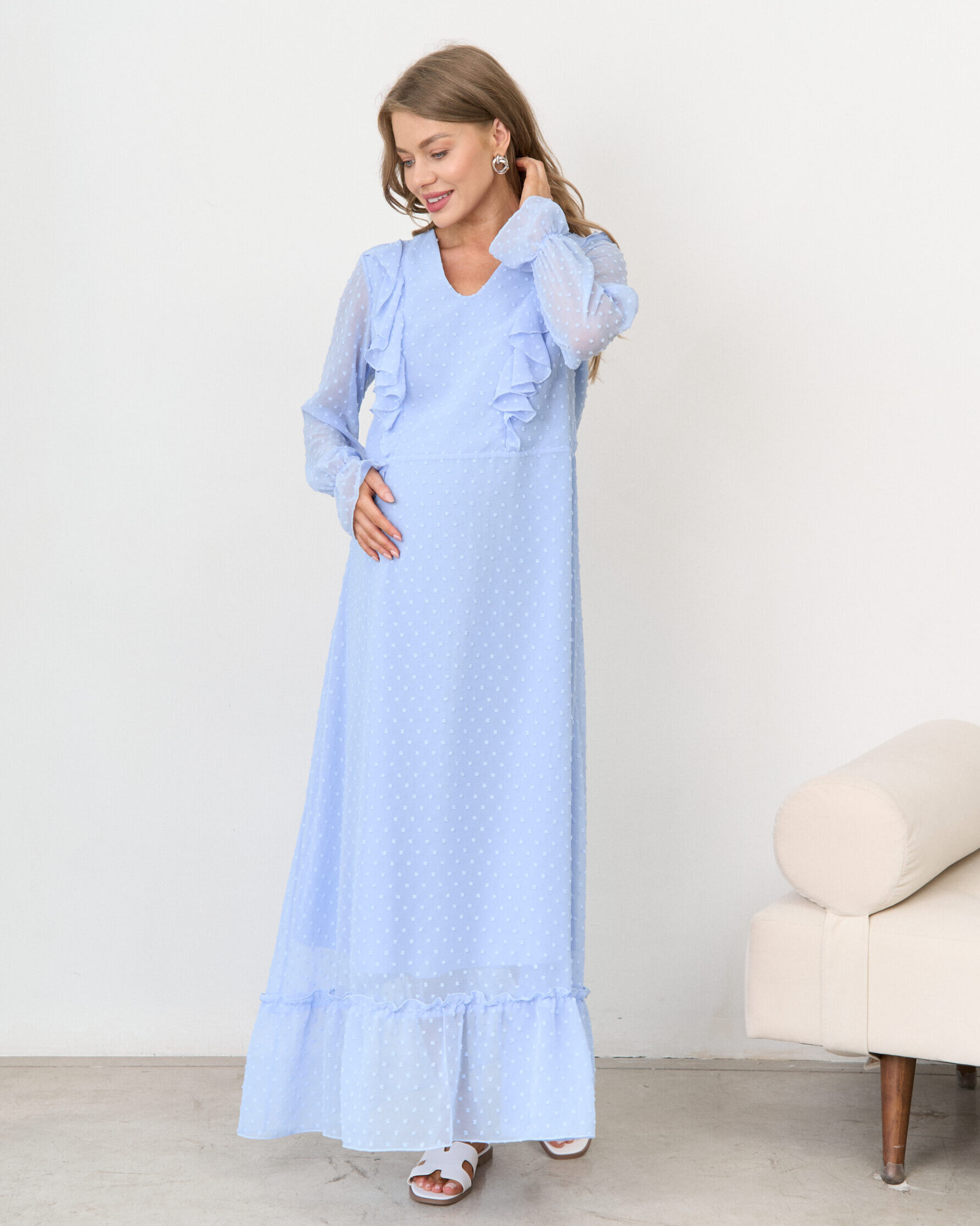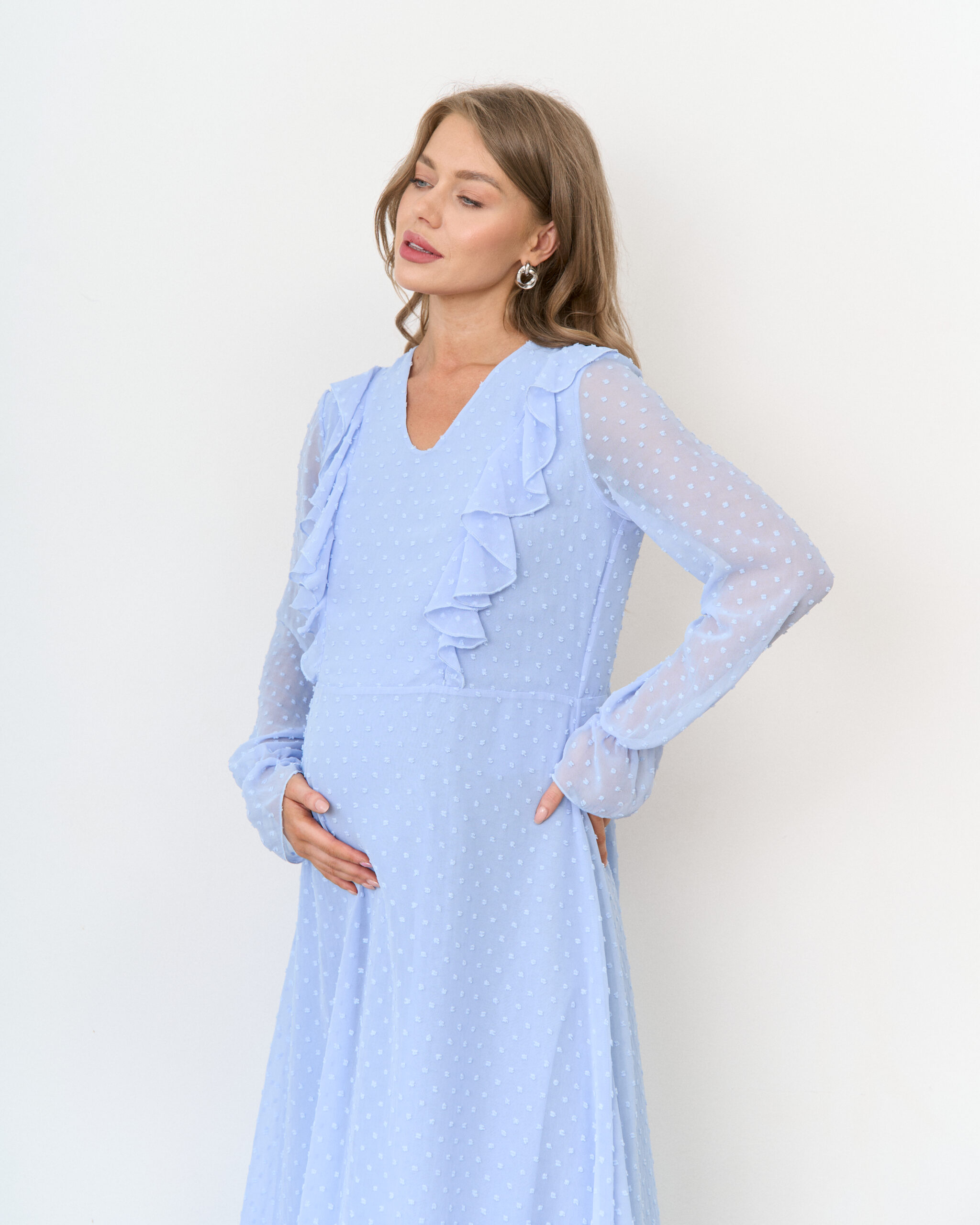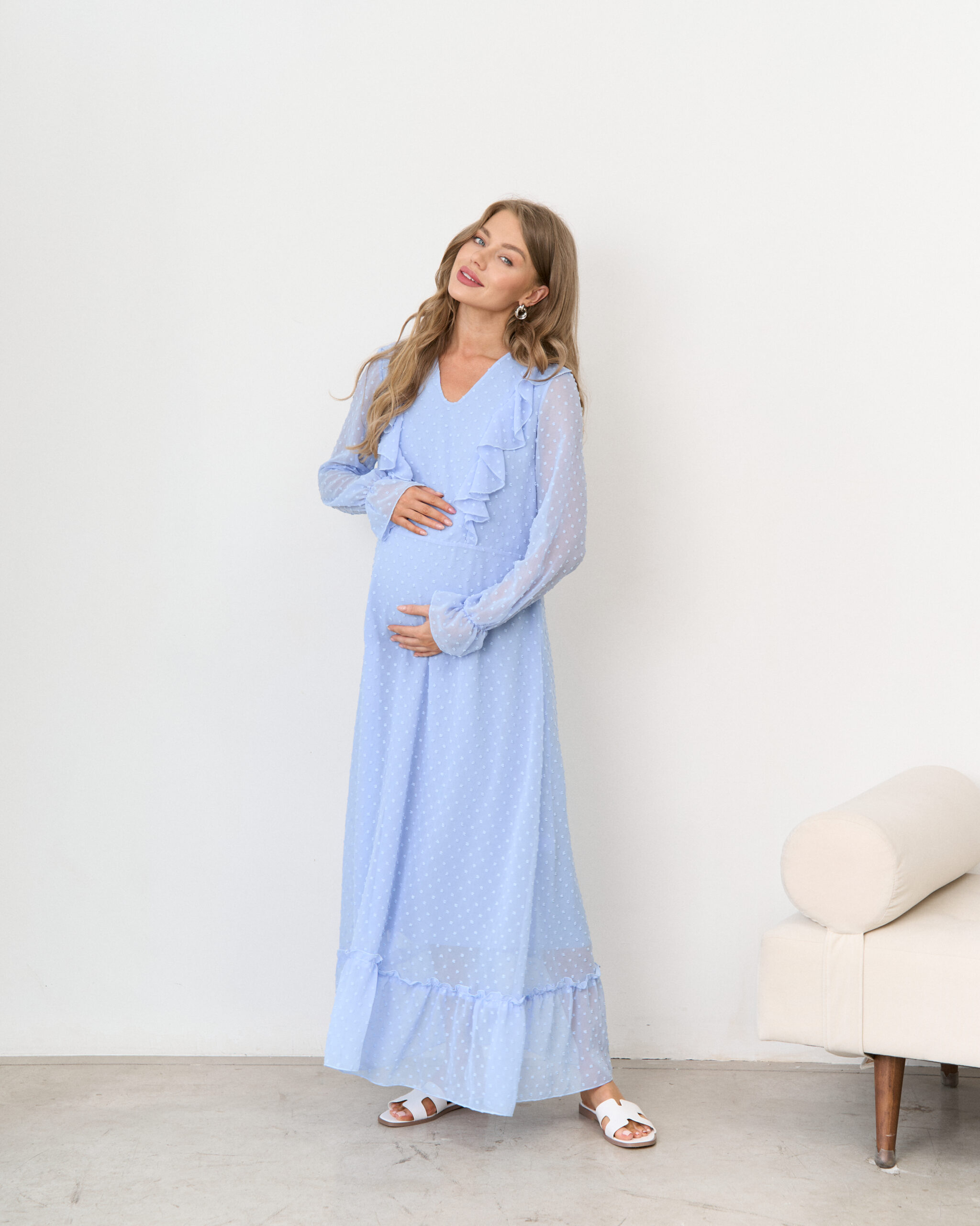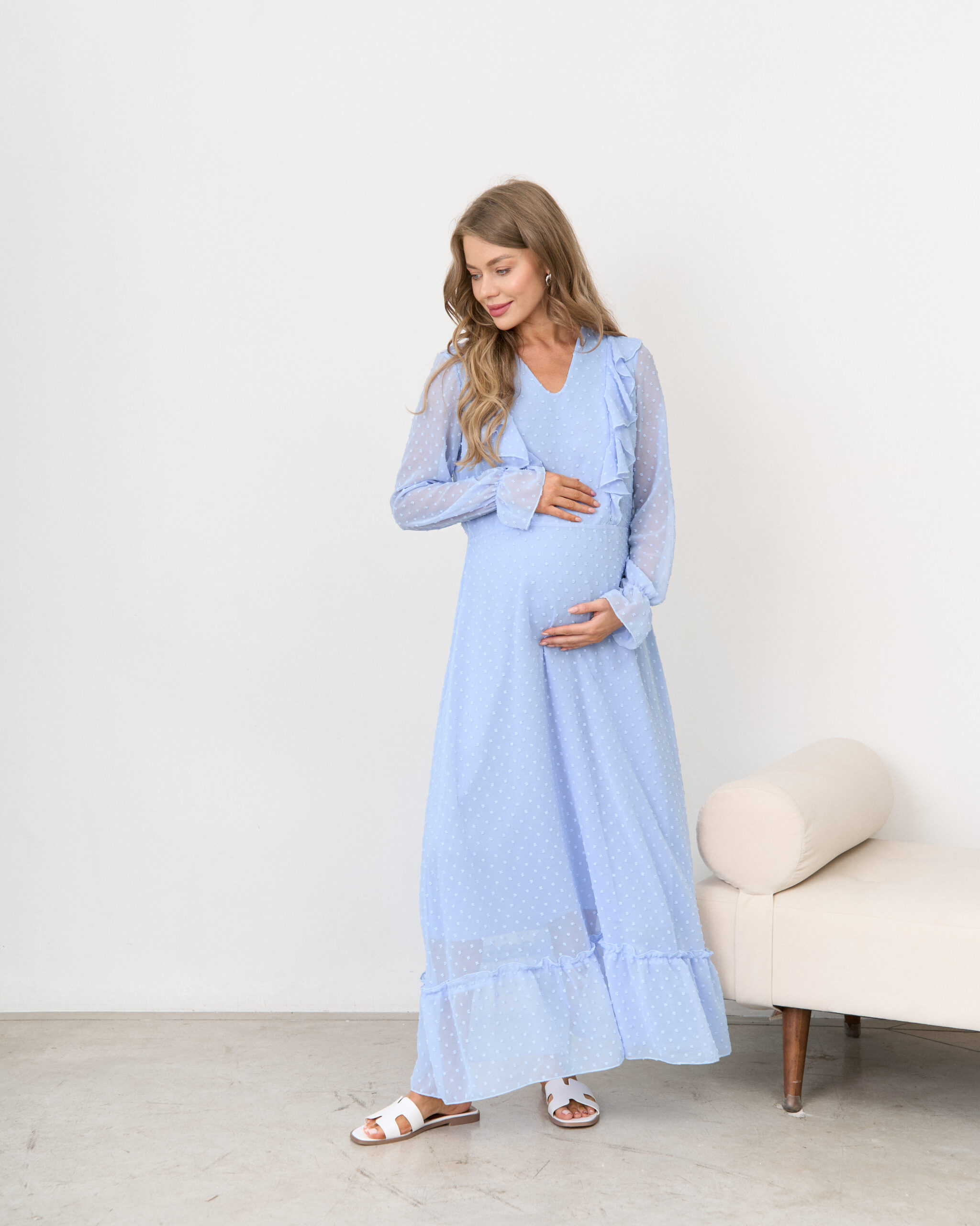 Женственное платье длины макси из струящегося шифона на подкладе из итальянской вискозы. В таком платье вы будете чувствовать себя утонченно и изысканно на любом сроке беременности и после. Для периода грудного вскармливания предназначены незаметные вертикальные молнии.