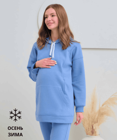 Теплое худи для будущих и кормящих мам из футера высшего качества «пенье» с начесом. Худи скроено специально для растущего животика и немного удлинено. Для грудного кормления — секреты в рельефах на груди в виде потайных молний. Так же есть карман спереди и удобный капюшон на завязках. В комплекте можно приобрести брючки Sport