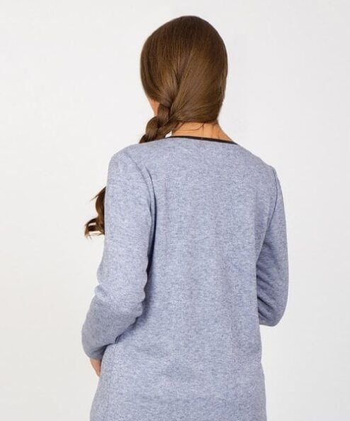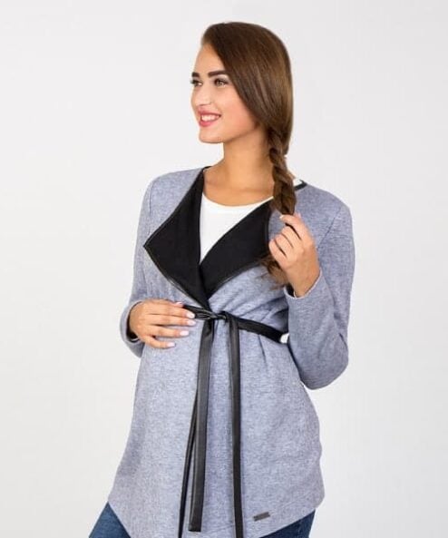 Стильный кардиган с цельнокроенным воротником из теплого двустороннего трикотажа и с отделкой из контрастной экокожи. Свободный силуэт и запах по переду дает вам возможность регулировать желаемую свободу, в зависимости от размера животика. Запах фиксируется поясом из экокожи.