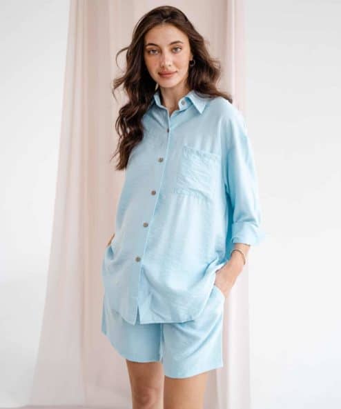 Костюм для беременных и кормящих мам из легкой хлопковой ткани состоит из мягких лаконичных шорт с удобной кулиской под животик и свободной рубашки с традиционным воротничком, застежкой спереди на маленькие пуговички и нагрудным карманом.