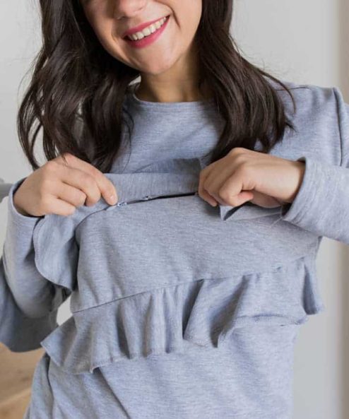 Трендовый хлопковый джемпер с необычными воланами, которые сейчас находятся на пике моды. Под воланами скрываются потайные молнии, чтобы была возможность в любое время покормить малыша. В комплекте можно приобрести брючки Summer.