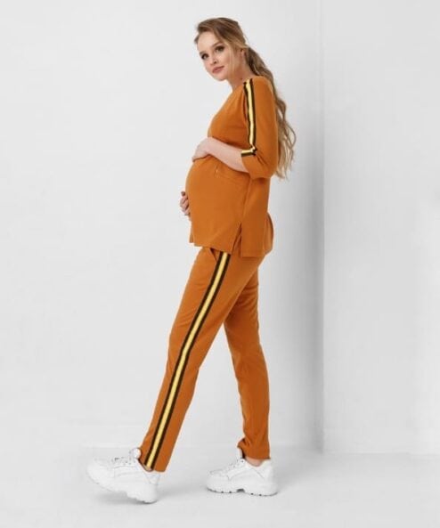 Костюм в трендовом горчичном цвете, состоящий из свитшота и брючек с лампасами. Удлиненный крой свитшота и потайные молнии позволяют носить его как во время беременности, так и в период кормления. У брюк мягкий бандажный пояс под растущий животик будущей мамы. Длина рукава — 3/4.