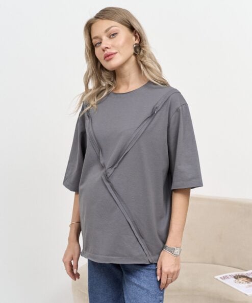Футболка кроя оверсайз из хлопкового трикотажа. Подойдет для любого срока беременности и после. Для кормления малыша выполнены удобные молнии, которые открываются сверху вниз. Изюминка модели — актуальные открытые швы на вороте, рукавах, по низу и спереди на футболке.