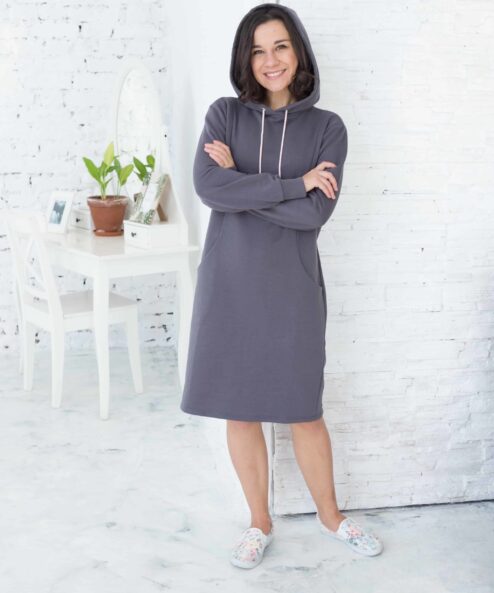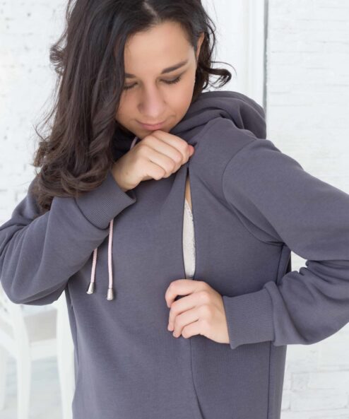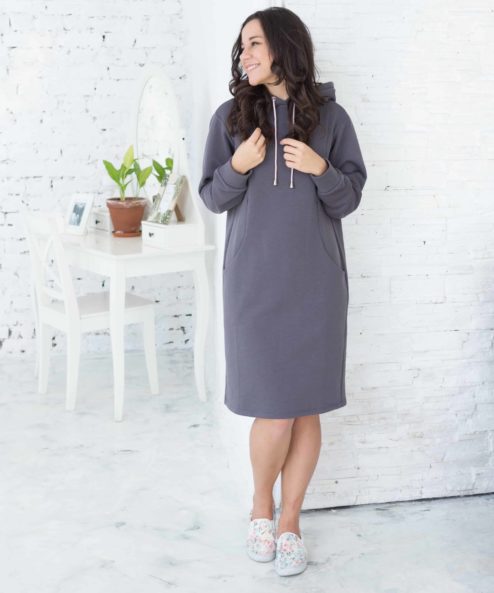 Платье-худи для будущих и кормящих мам из футера высшего качества «пенье» с петельной изненкой. Платье выполнено в комфортной длине и скроено специально для растущего животика. Для кормления малыша — секреты в рельефах на груди в виде потайных молний. Так же есть удобные боковые карманы и капюшон с регулируемыми завязками.