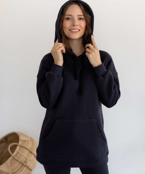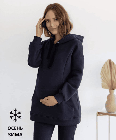 Теплое худи для будущих и кормящих мам из футера высшего качества «пенье» с начесом. Худи скроено специально для растущего животика и немного удлинено. Для грудного кормления — секреты в рельефах на груди в виде потайных молний. Так же есть карман спереди и удобный капюшон на завязках. В комплекте можно приобрести брючки Sport.