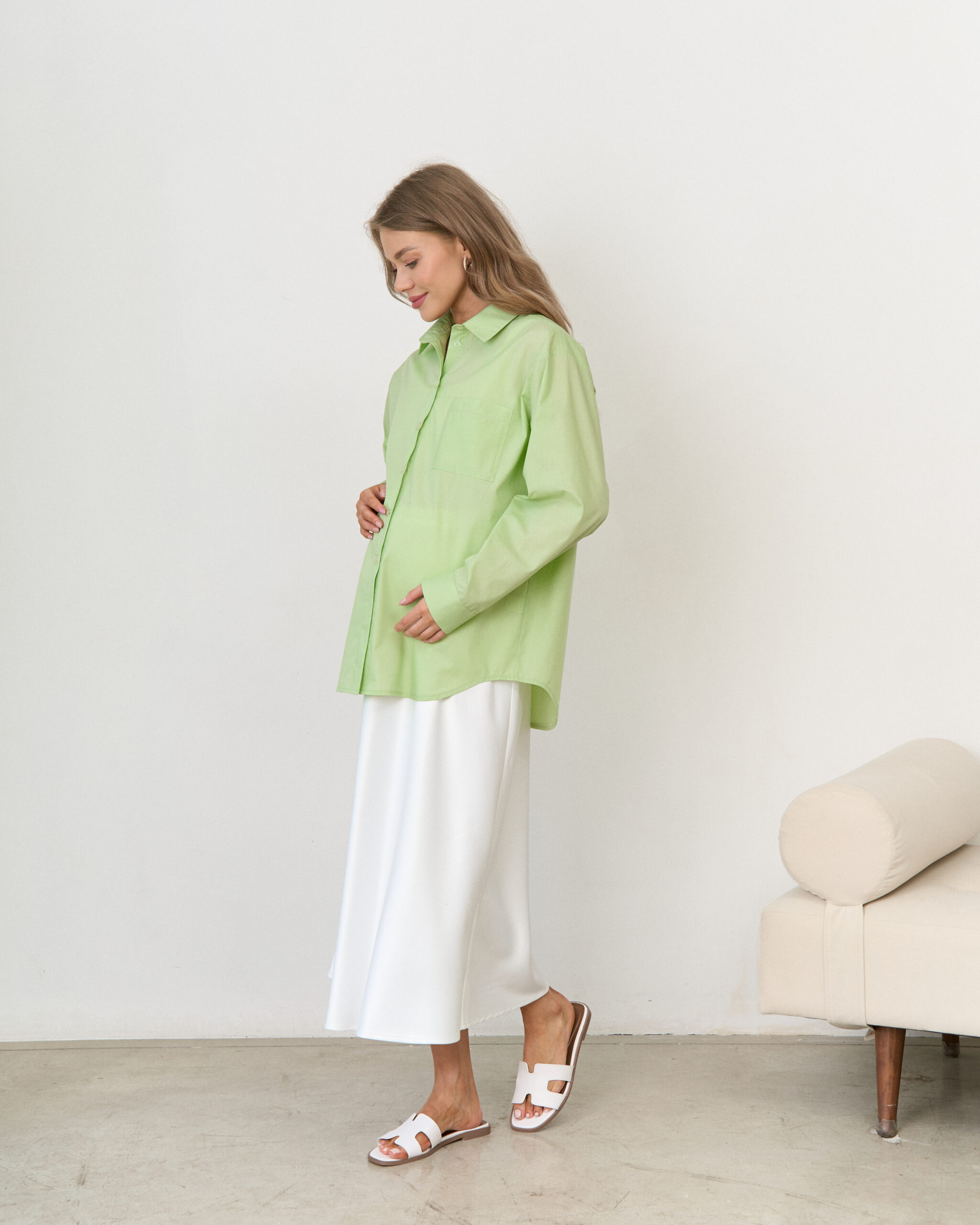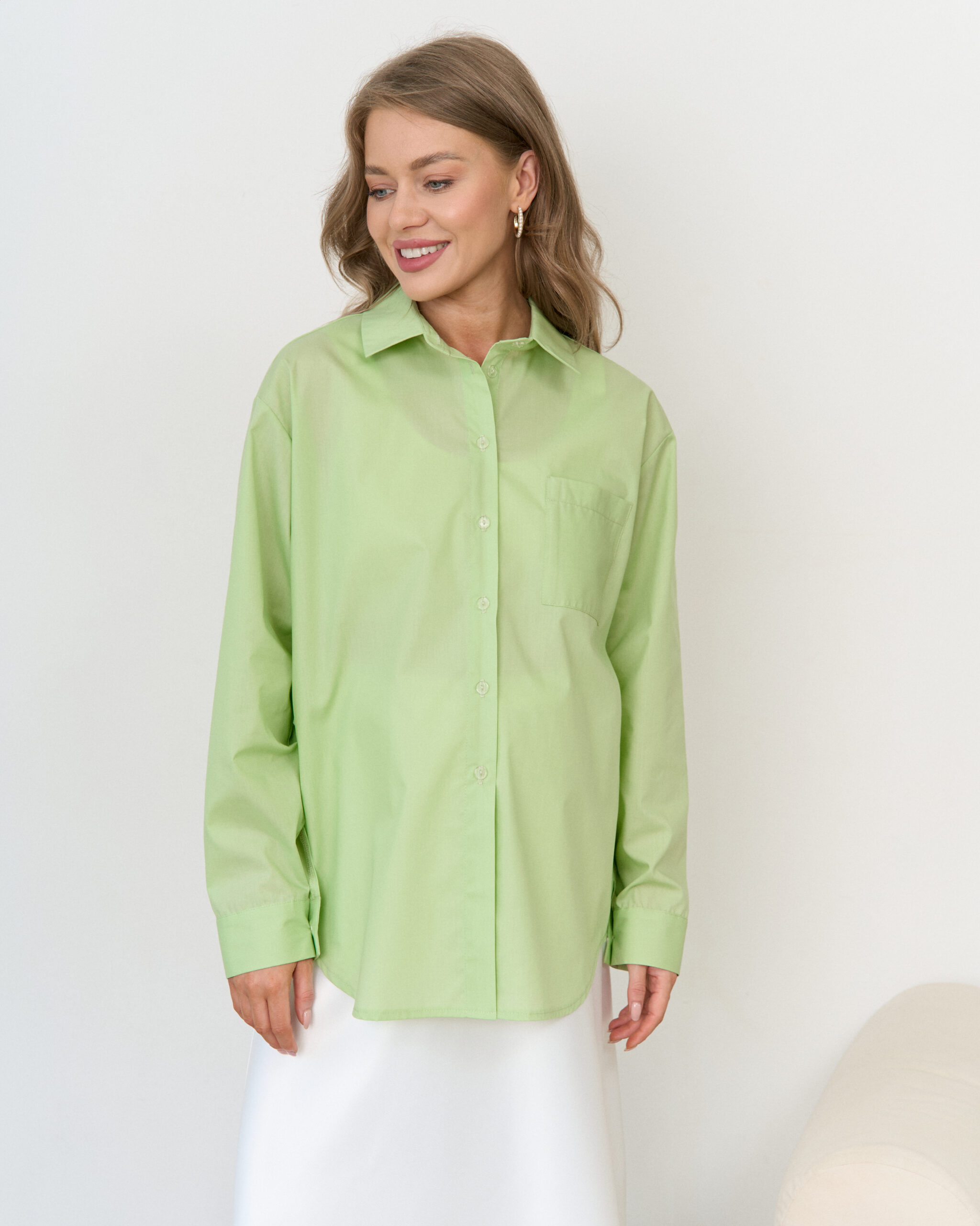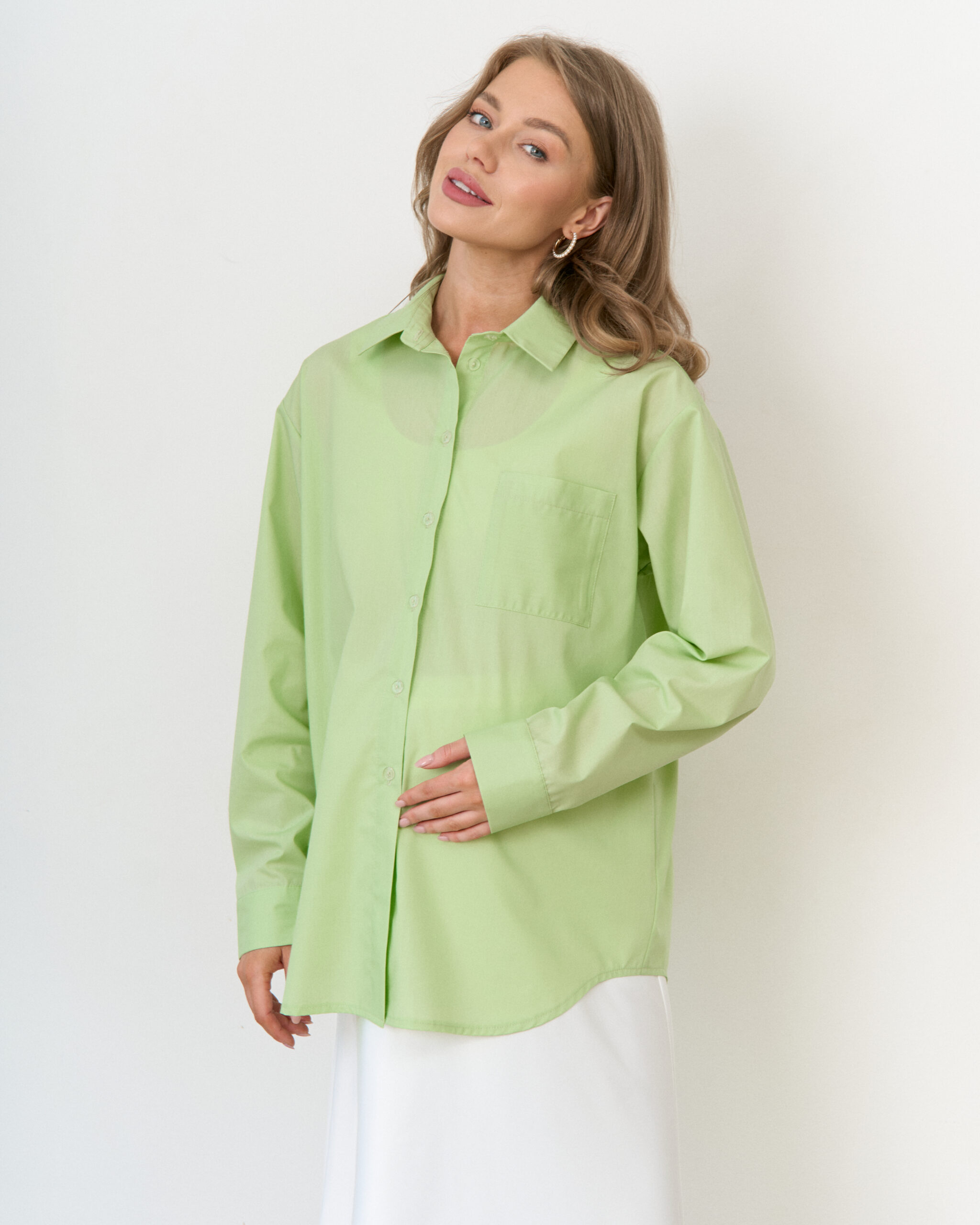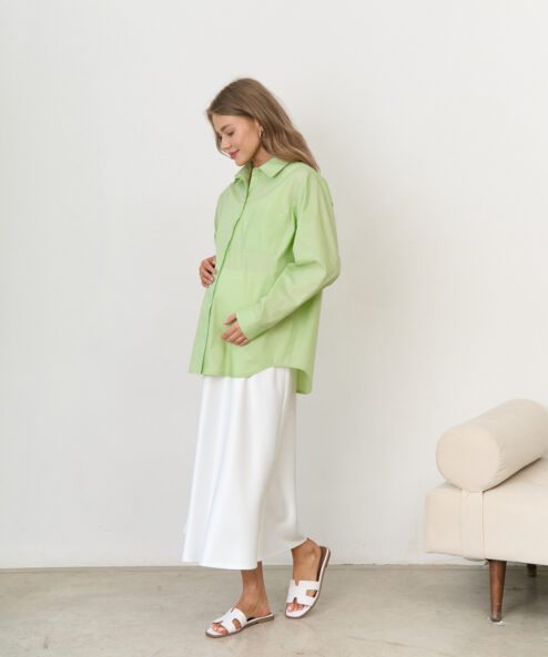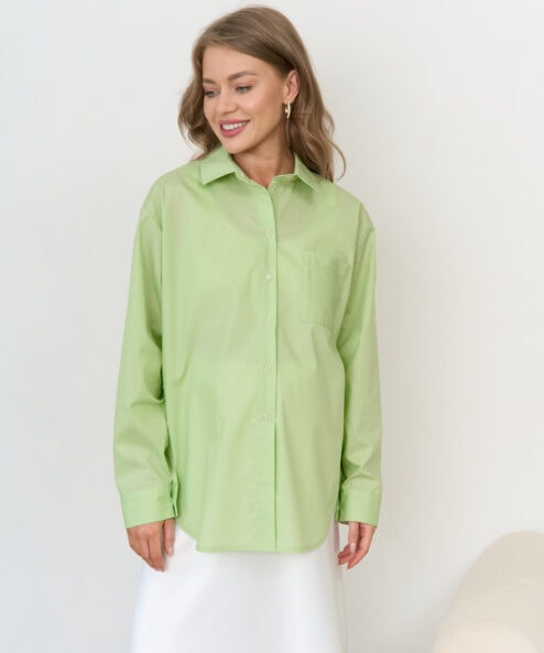 Стильная удлиненная рубашка оверсайз для беременных и кормящих мам. Легкая полупрозрачная ткань и модный фасон идеальны для летних образов. Для кормления пуговицы расстегиваются.