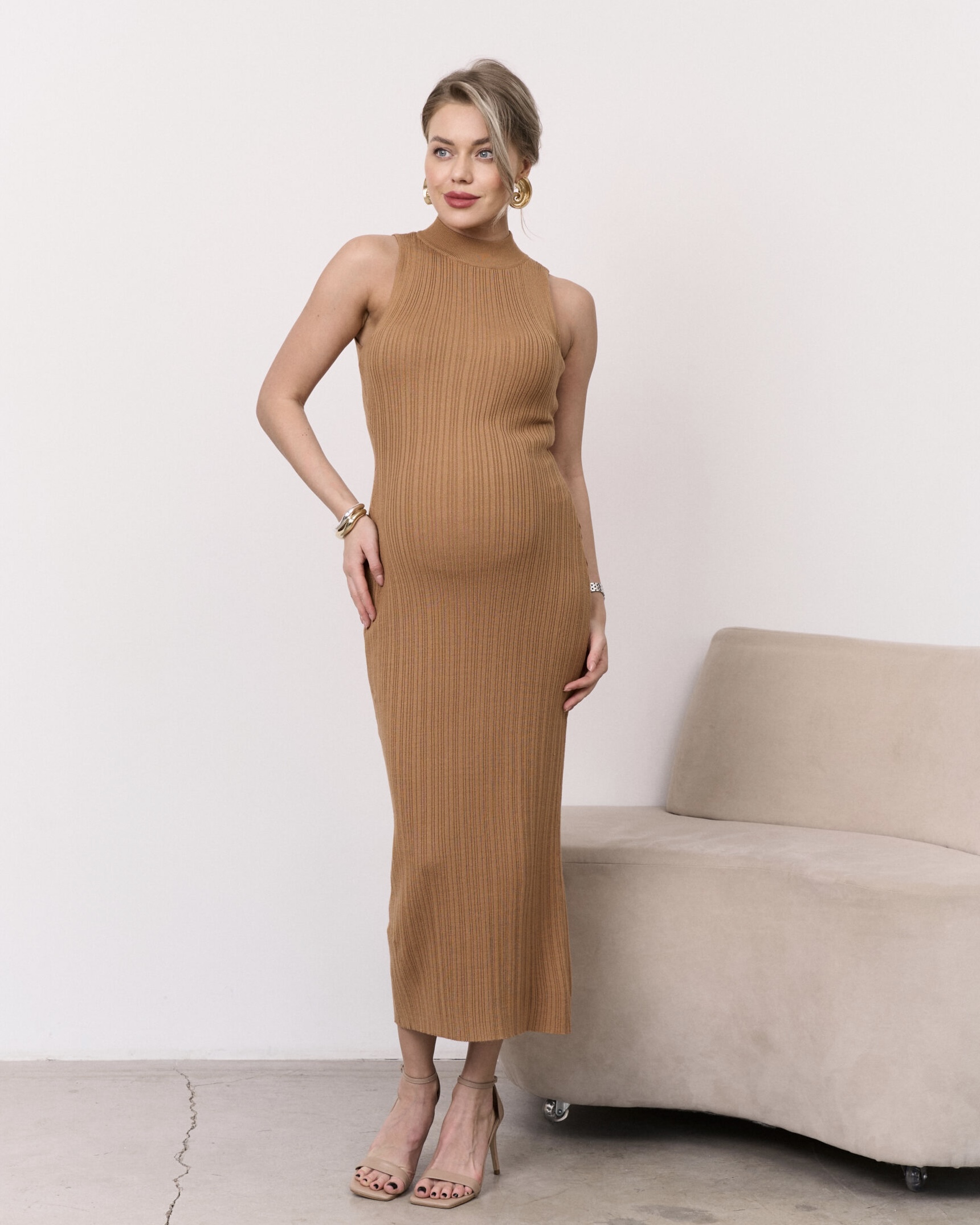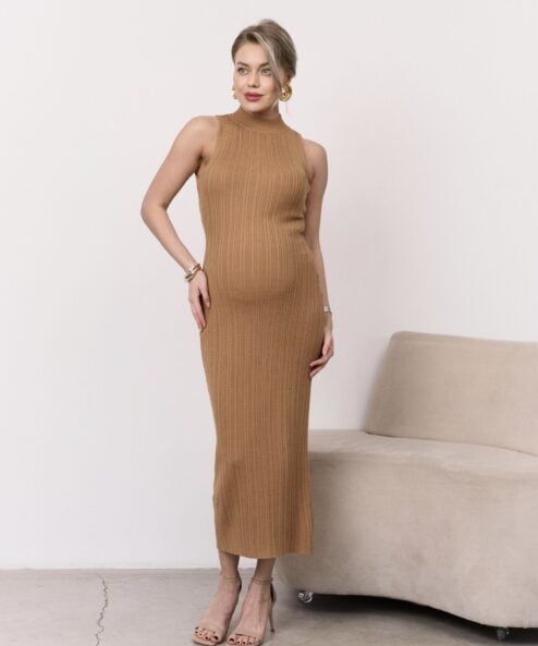 Трендовое трикотажное платье в длине миди из мягкой вискозной пряжи. Благодаря эластичной вязке платье отлично подойдёт на весь срок беременности и после. Рекомендуем для размеров 42-48.