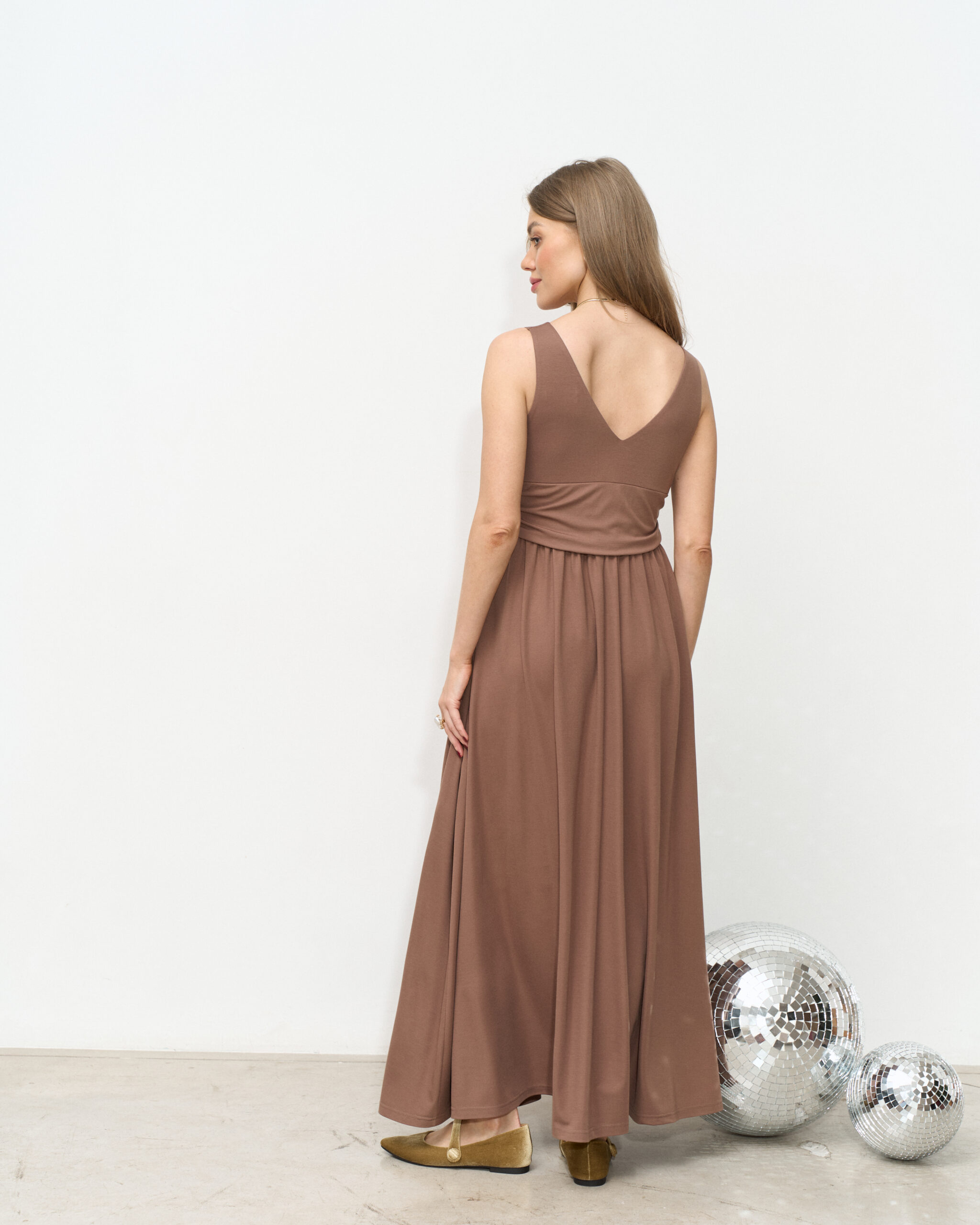 Трикотажное платье в длине макси из струящейся ткани — отличный выбор для праздников и торжеств.