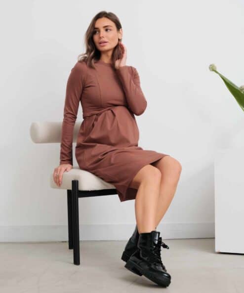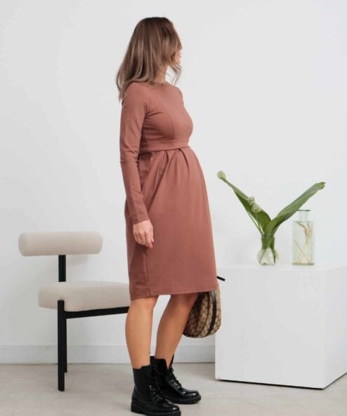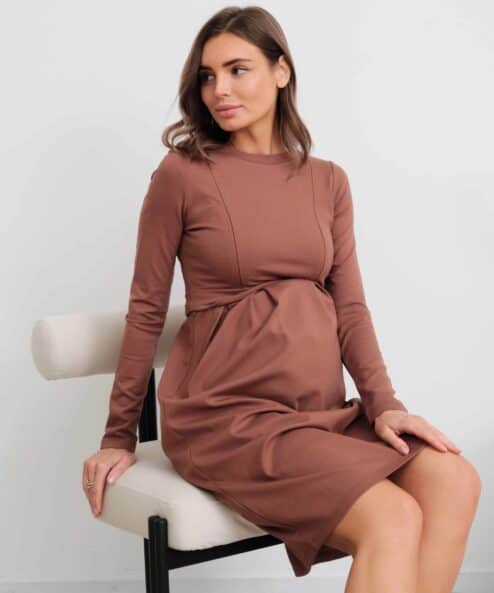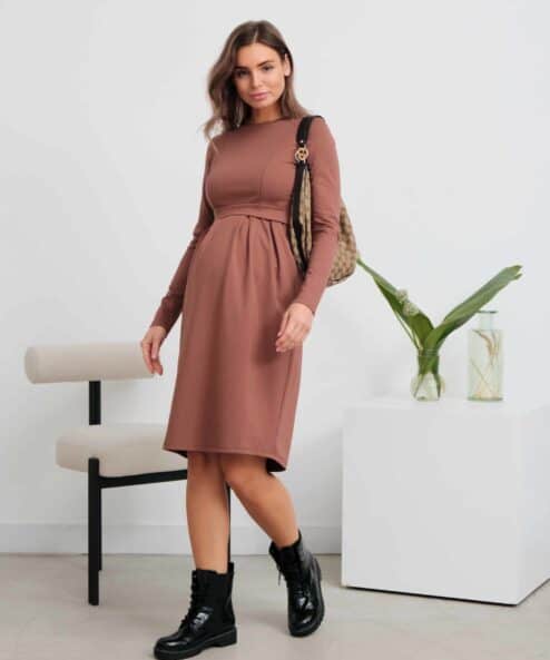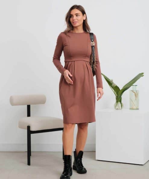 Платье полуприлегающего силуэта, которое отлично подчеркнет особенности фигуры будущей мамы. Комфортно ощущается на теле и не сковывает движение. В данной модели предусмотрен секрет для кормления, что позволяет носить платье и после беременности.