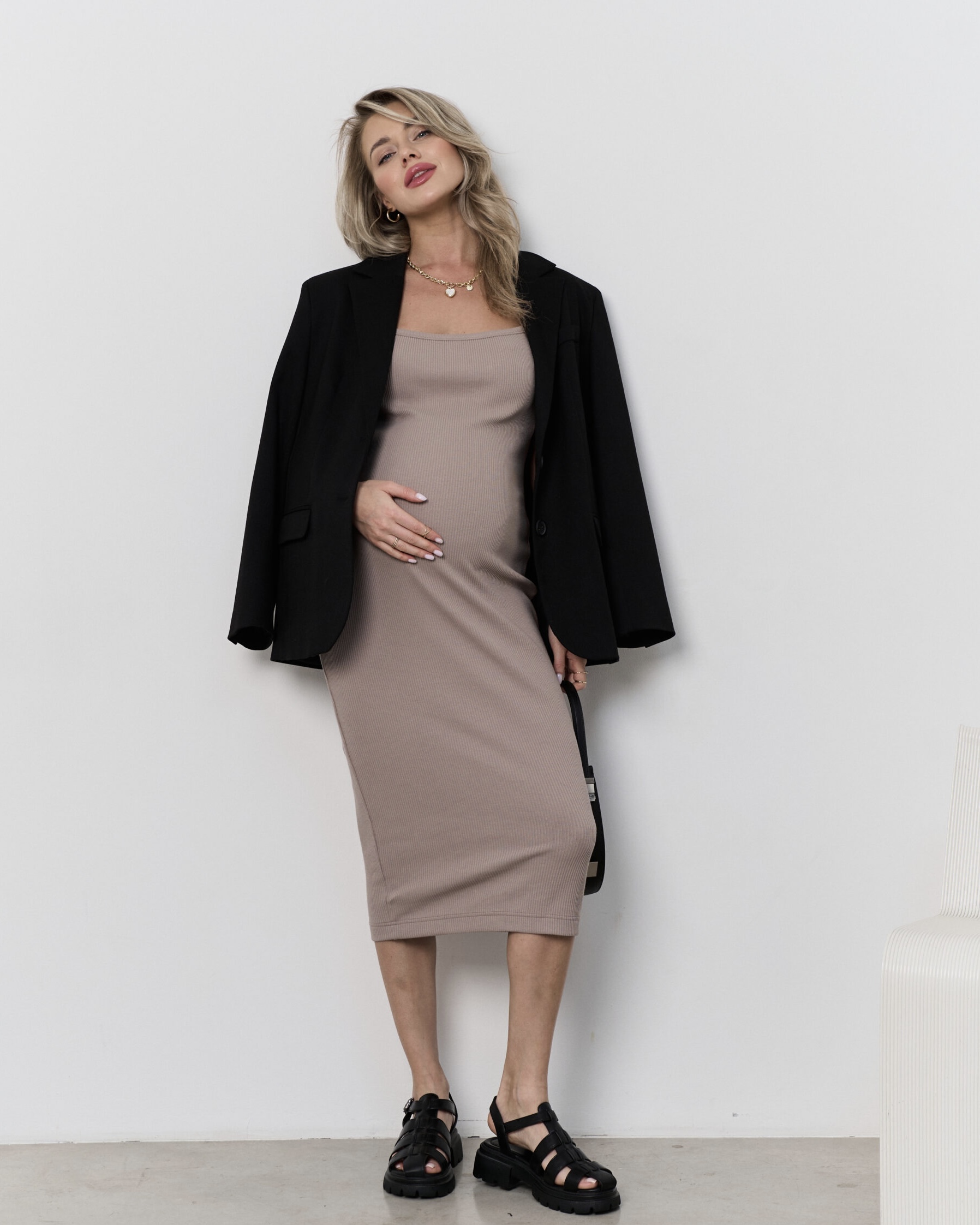 Платье для беременных и кормящих мам облегающего фасона из трикотажа в рубчик.