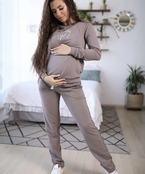 Этот современный костюм из плотного хлопкового трикотажа подойдет на весь период беременности и после. На брюках — высокий пояс, чтобы утеплить растущий животик будущей мамы, и шнурок для регулировки объема. На свитшоте — принт «Be the light» и незаметные молнии для кормления малыша.
