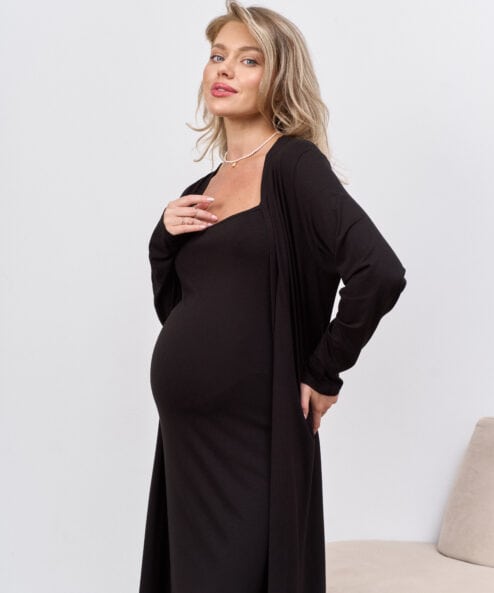 Этот трендовый комплект для мам состоит из платья-комбинации и кардигана с поясом. Он выполнен из мягчайшей вискозы, которая ощущается, как вторая кожа. Подойдет на весь период беременности и после. Комплект идеально подойдет в качестве домашнего образа, на каждый день и для фотосессии беременности.