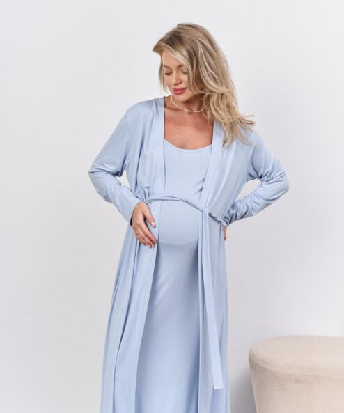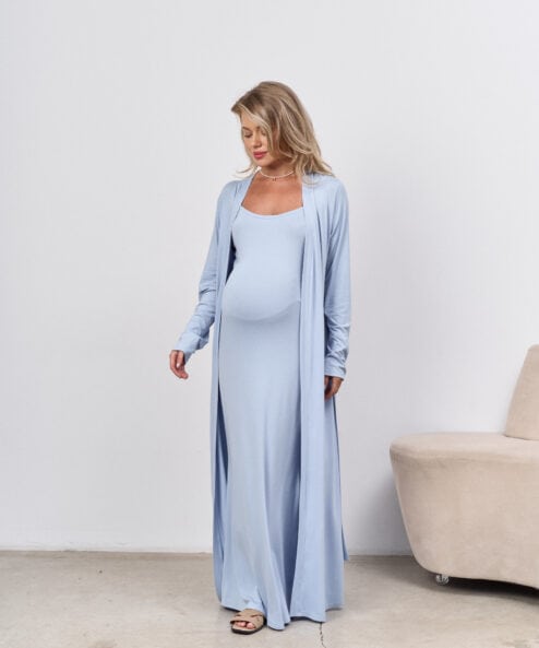 Этот трендовый комплект для мам состоит из платья-комбинации и кардигана с поясом. Он выполнен из мягчайшей вискозы, которая ощущается, как вторая кожа. Подойдет на весь период беременности и после. Комплект идеально подойдет в качестве домашнего образа, на каждый день и для фотосессии беременности.