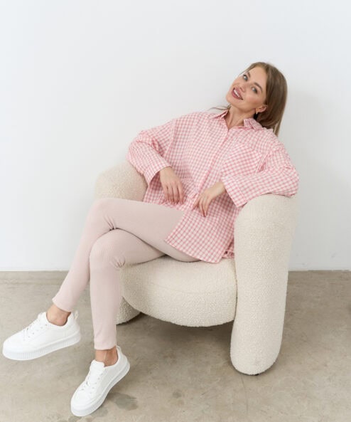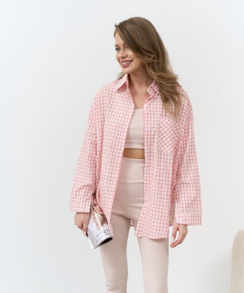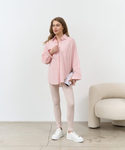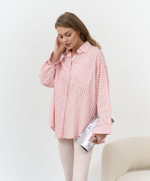 Стильная удлиненная рубашка в клетку для беременных и кормящих мам. Такую рубашку можно носить как с классическими брюками, так и с джинсами в стиле casual. Для кормления пуговицы расстегиваются.