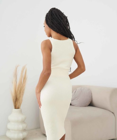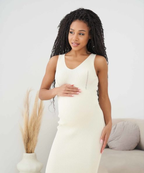Трикотажное платье в длине миди из хлопковой пряжи. Благодаря эластичной вязке подойдёт на весь срок беременности и после.