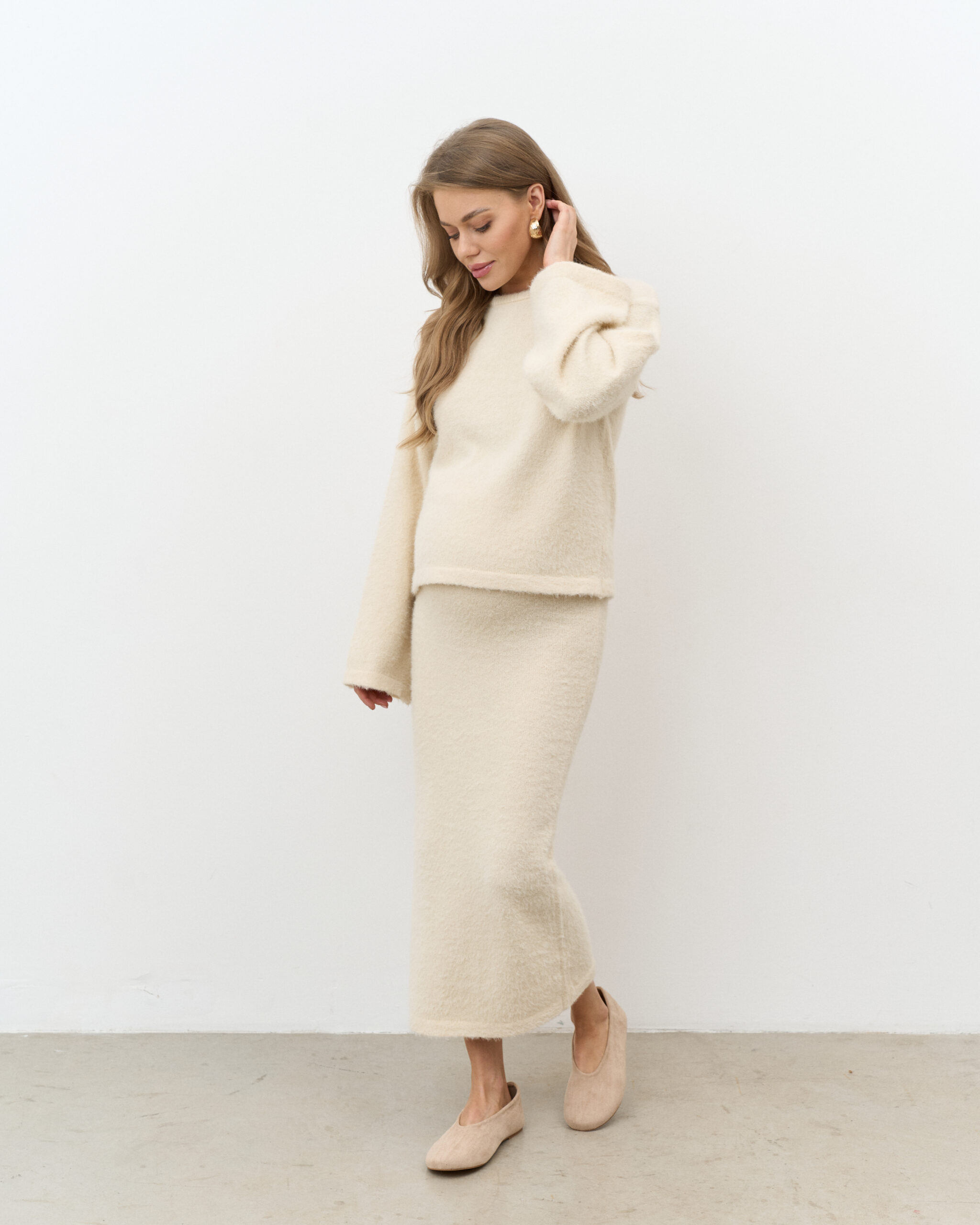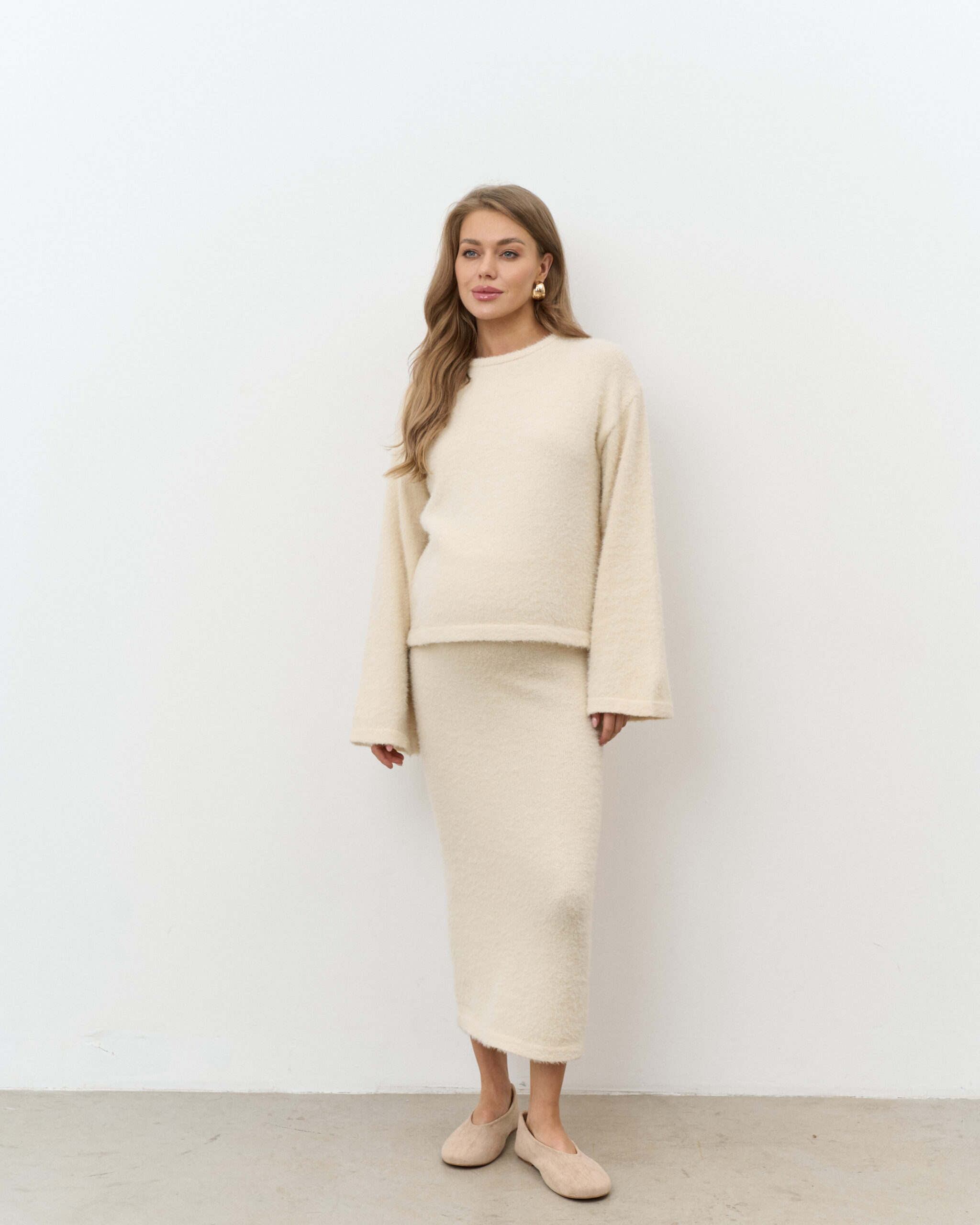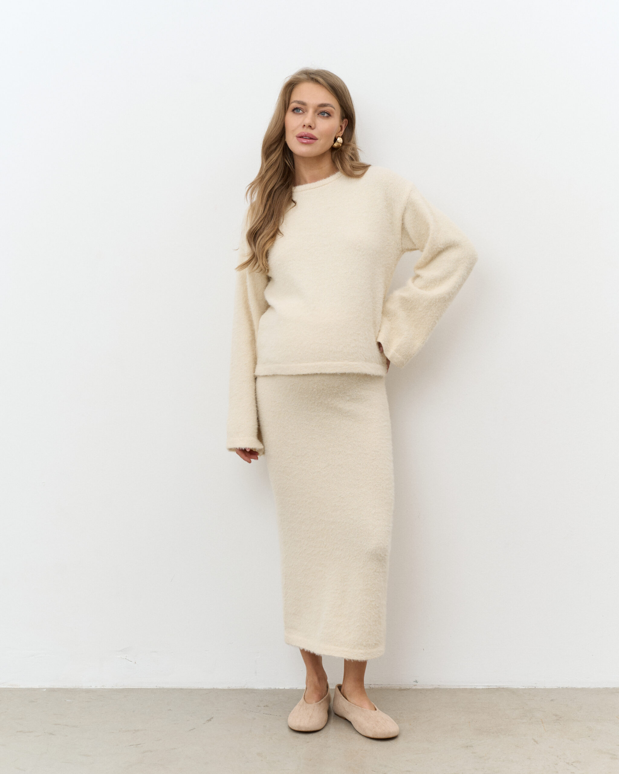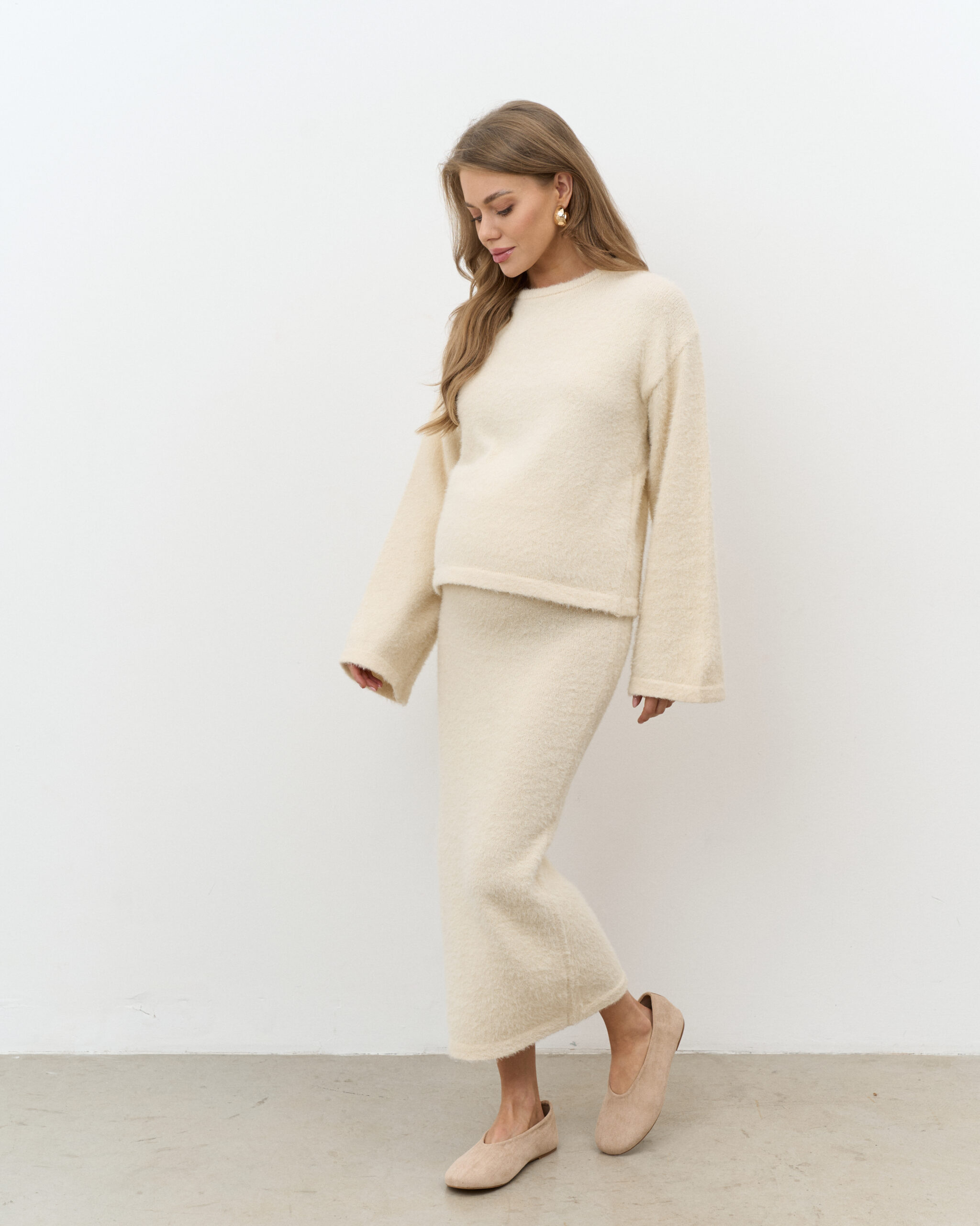 Стильный трикотажный комплект из пушистой пряжи, состоящий из макси-юбки прямого кроя и базового джемпера. Модный фасон стройнит и визуально вытягивает фигуру. Подойдет на период беременности и после.