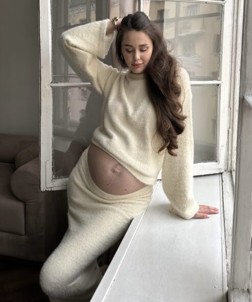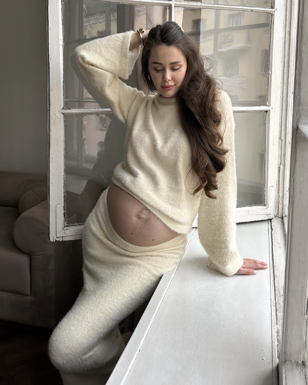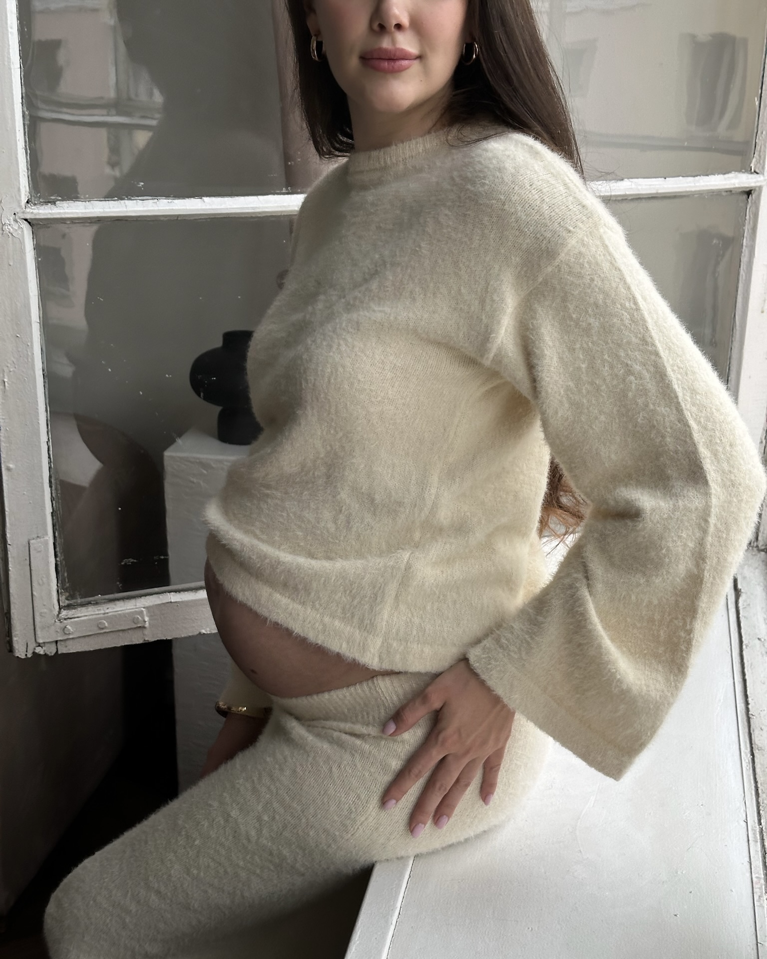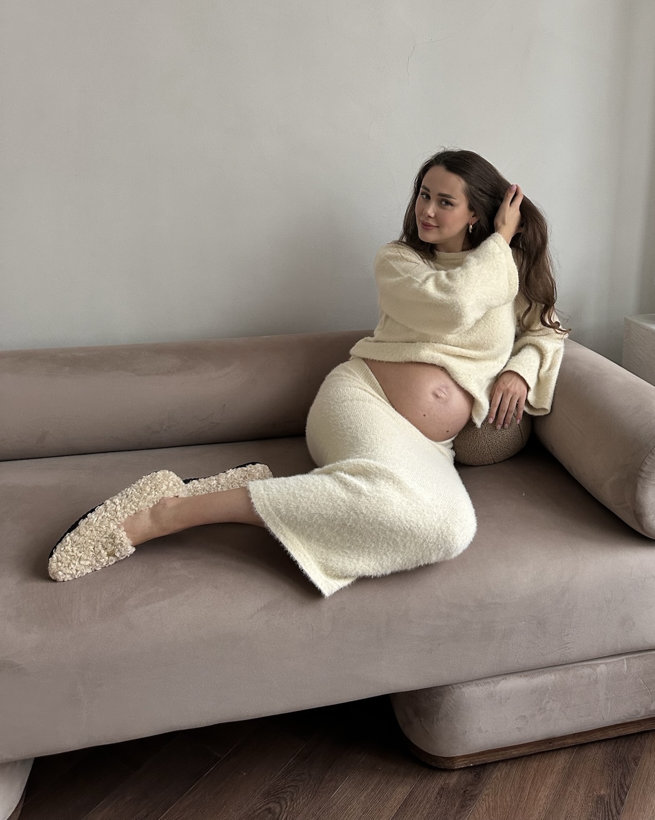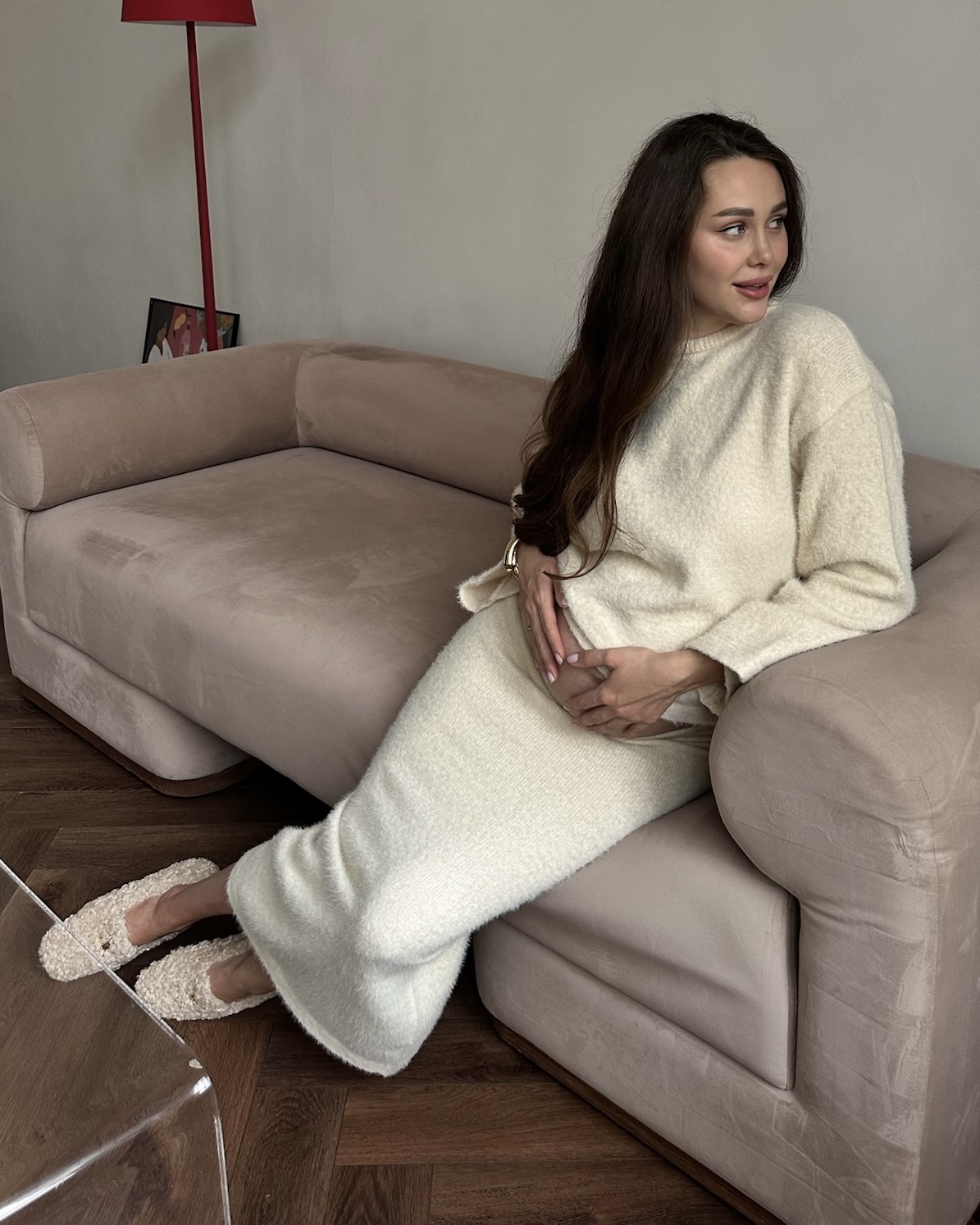 Стильный трикотажный комплект из пушистой пряжи, состоящий из макси-юбки прямого кроя и базового джемпера. Модный фасон стройнит и визуально вытягивает фигуру. Подойдет на период беременности и после.