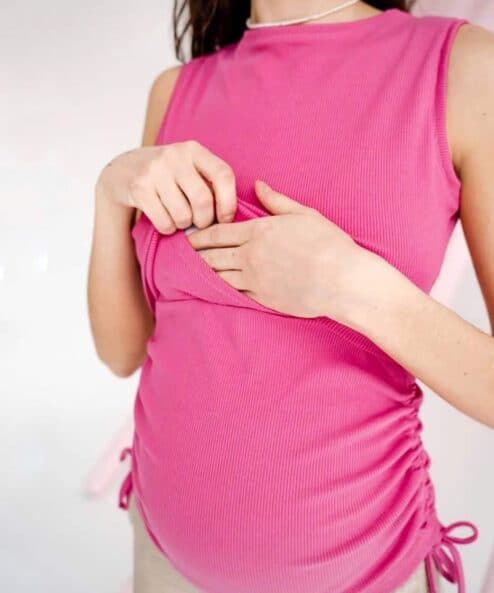 Майка для беременных и кормящих мамочек. Изделие выполнено из мягкого трикотажа в рубчик, по бокам расположены кулиски, на груди полочка, которая выгодно маскирует секрет для кормления малыша.