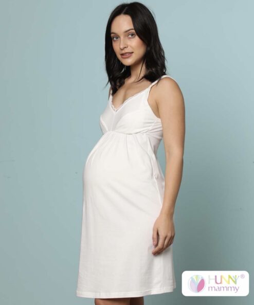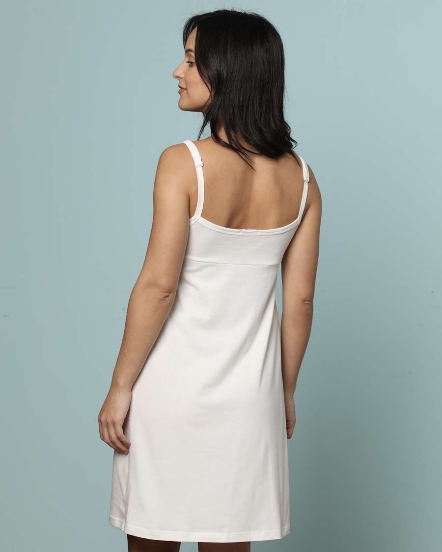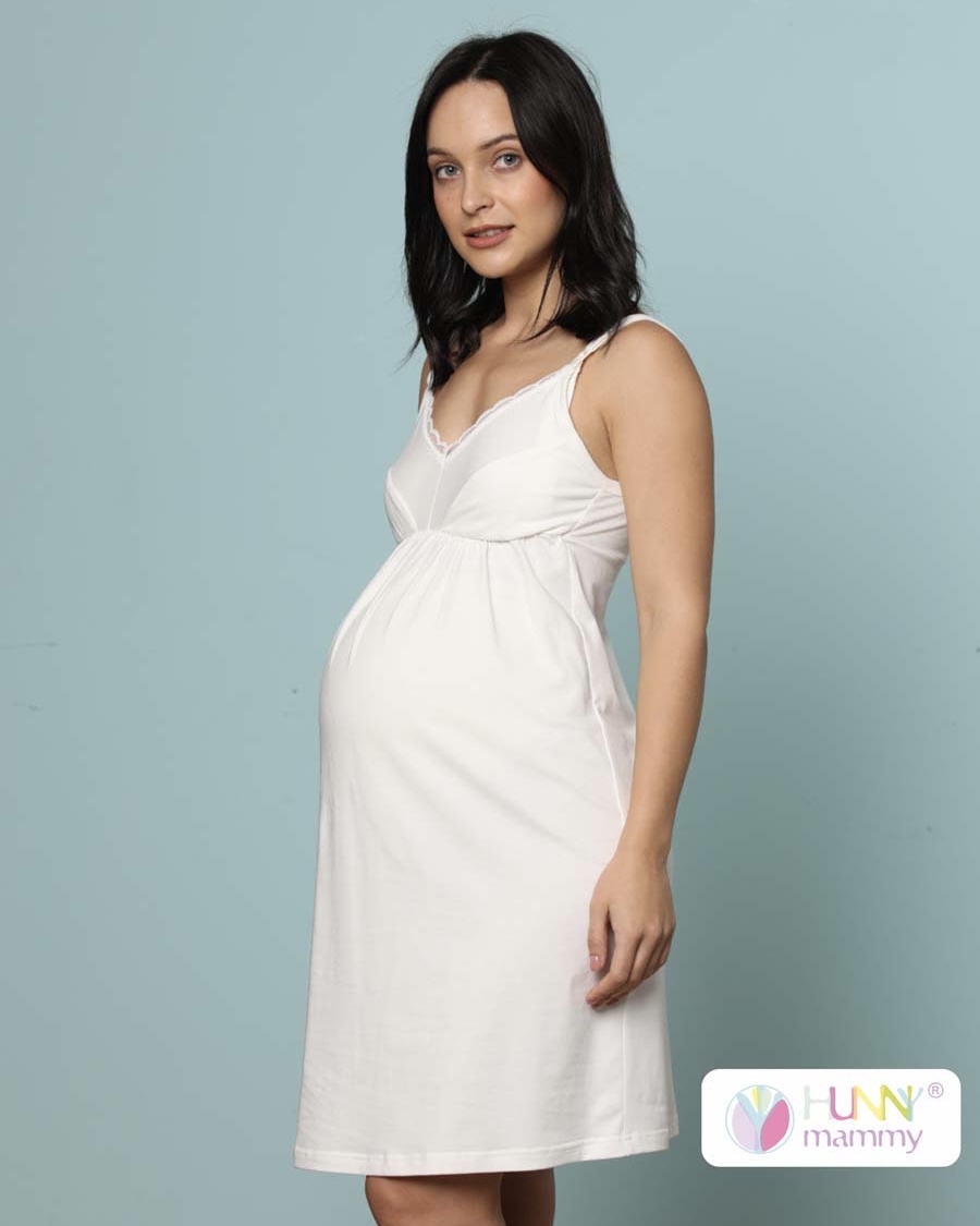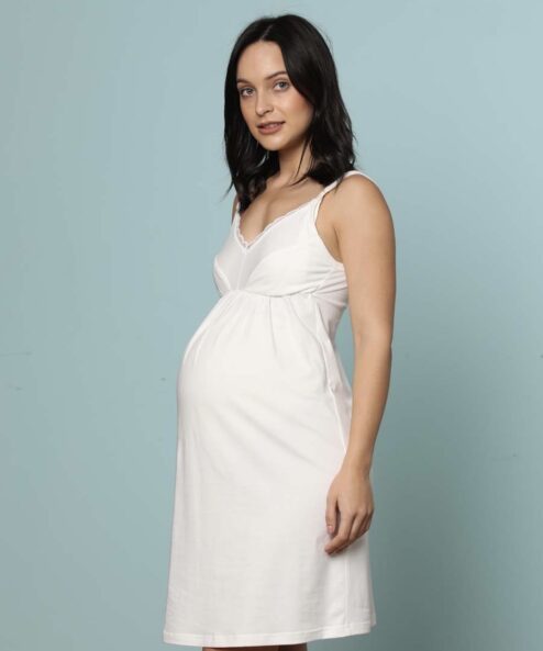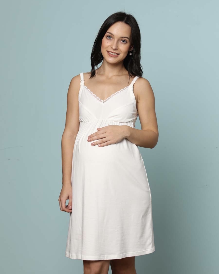 Красивая и удобная сорочка для беременных и кормящих мам. Верх изделия облегающий с регулируемыми по длине бретелями и застежками для удобного кормления малыша. Отделка утонченным кружевом.