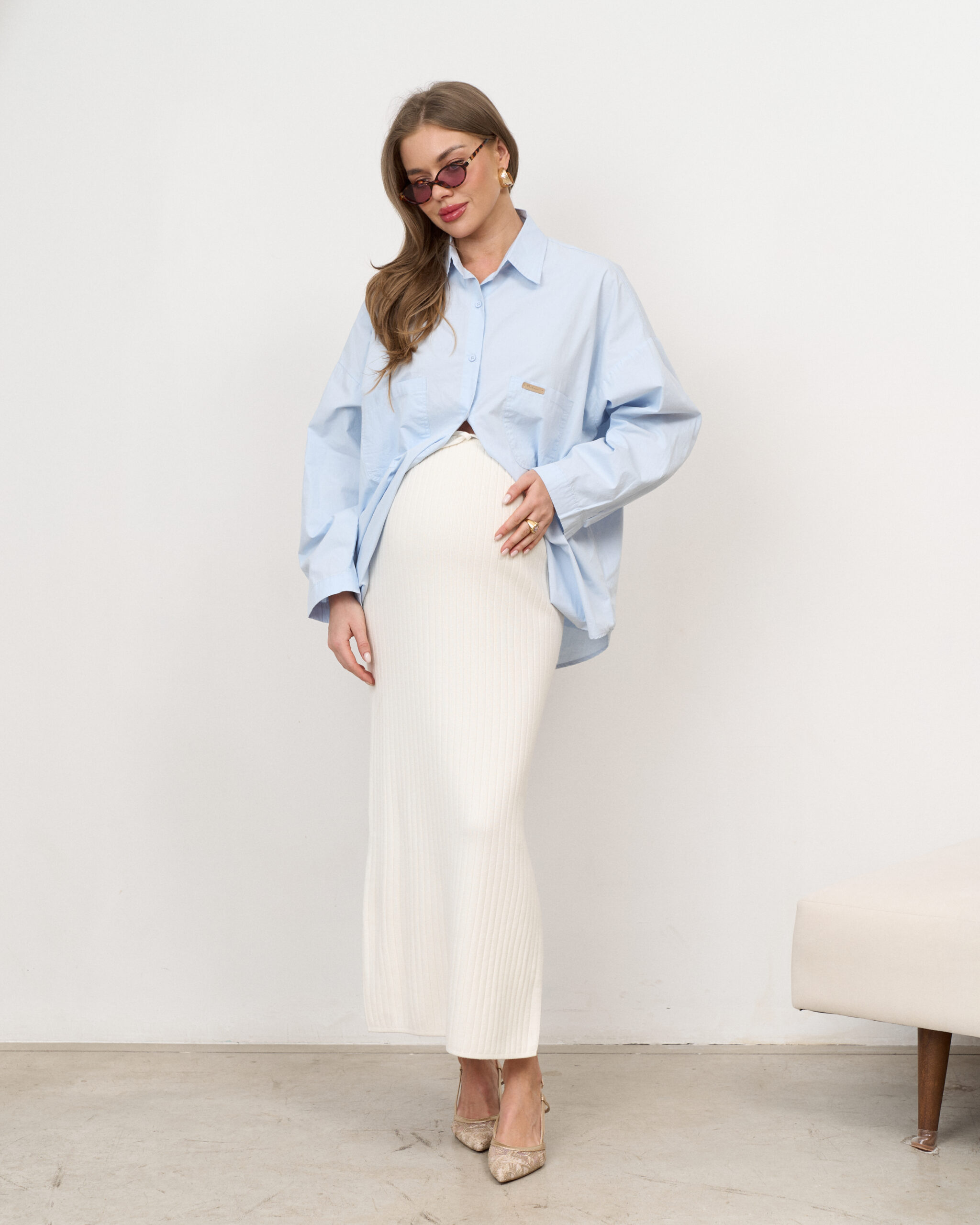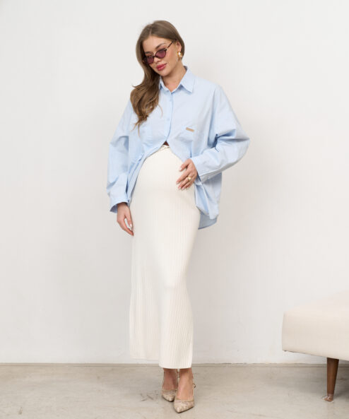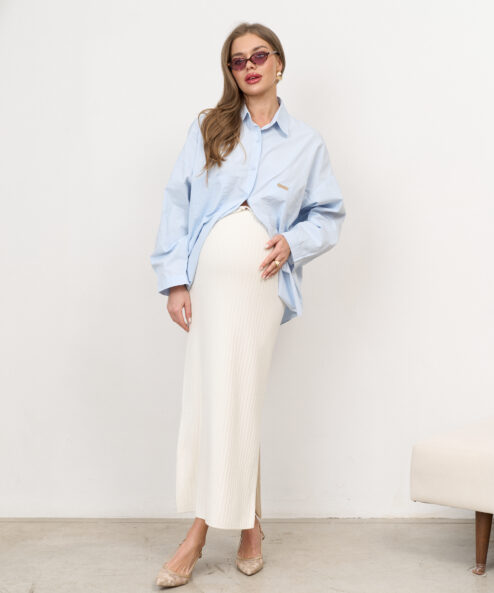 Стильная юбка в длине миди из трикотажной ткани с разрезом. Мягкий эластичный пояс позволит носить юбку на любом сроке беременности и после.