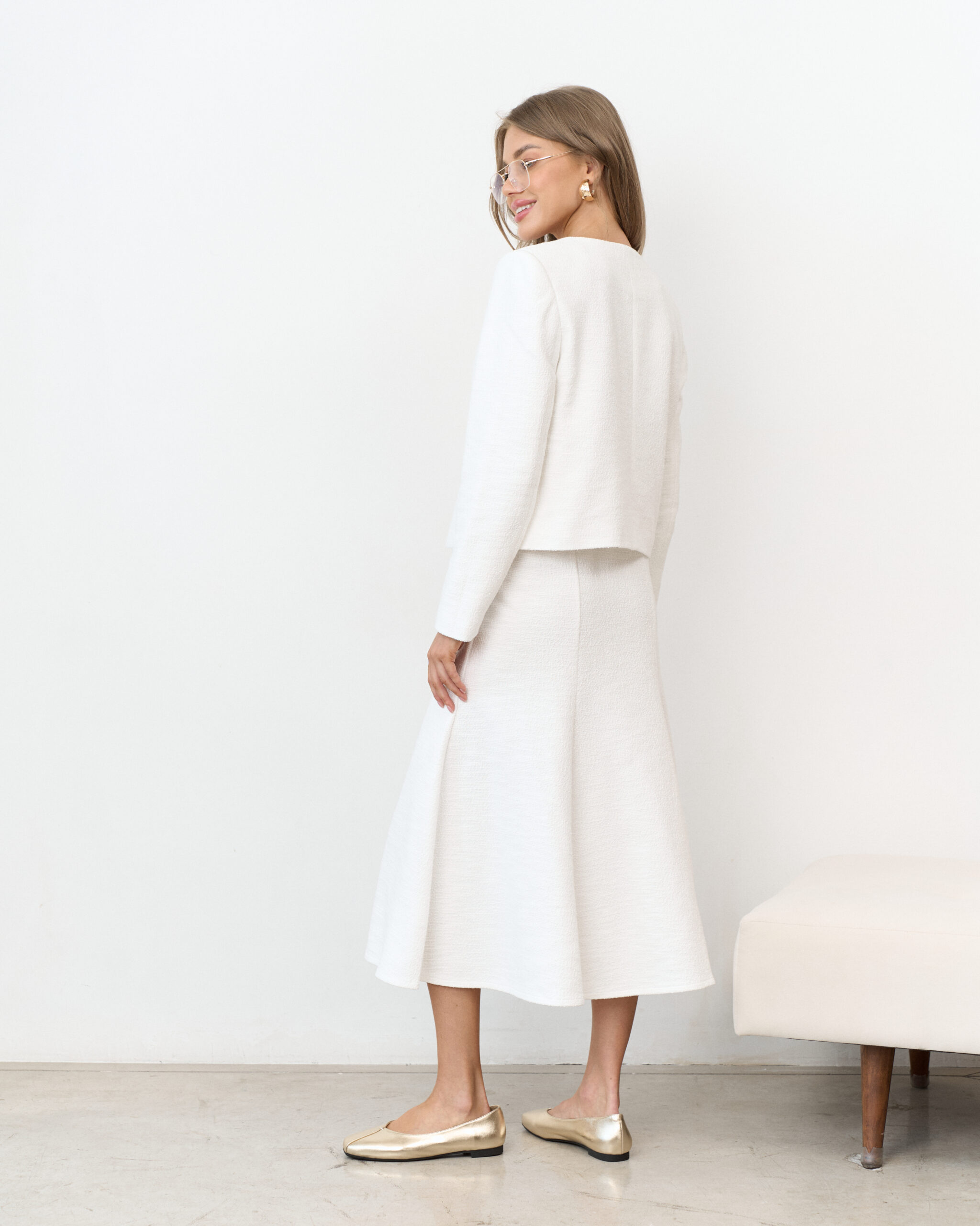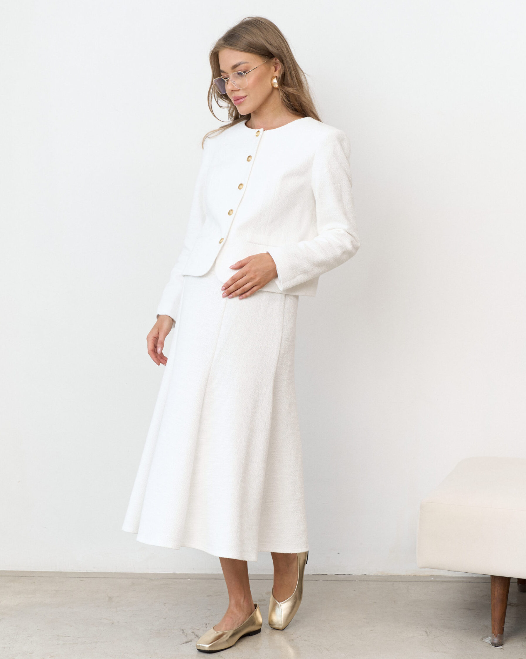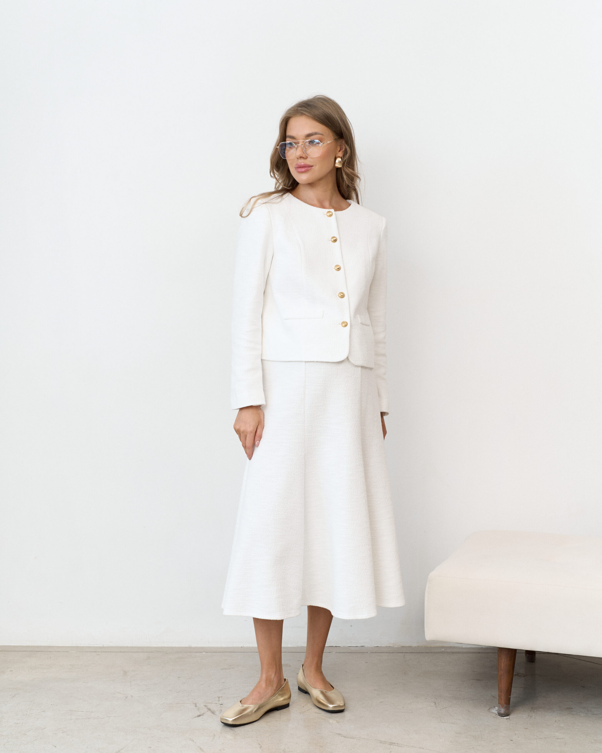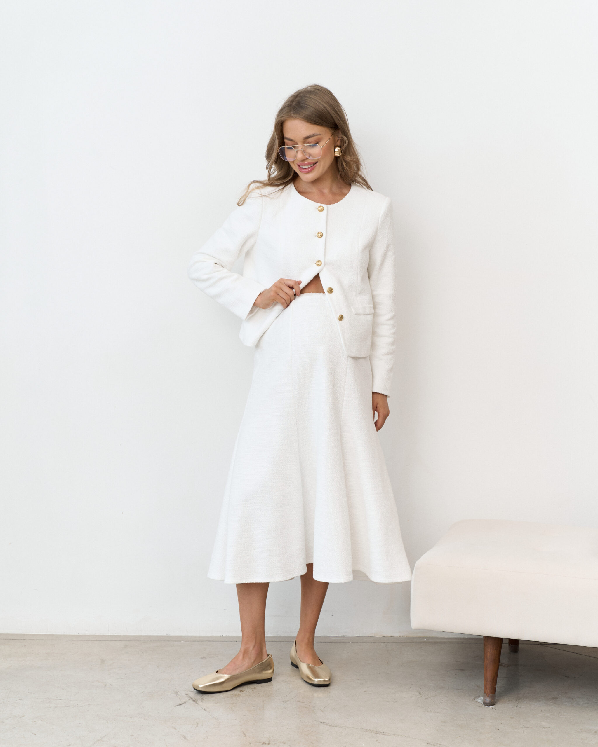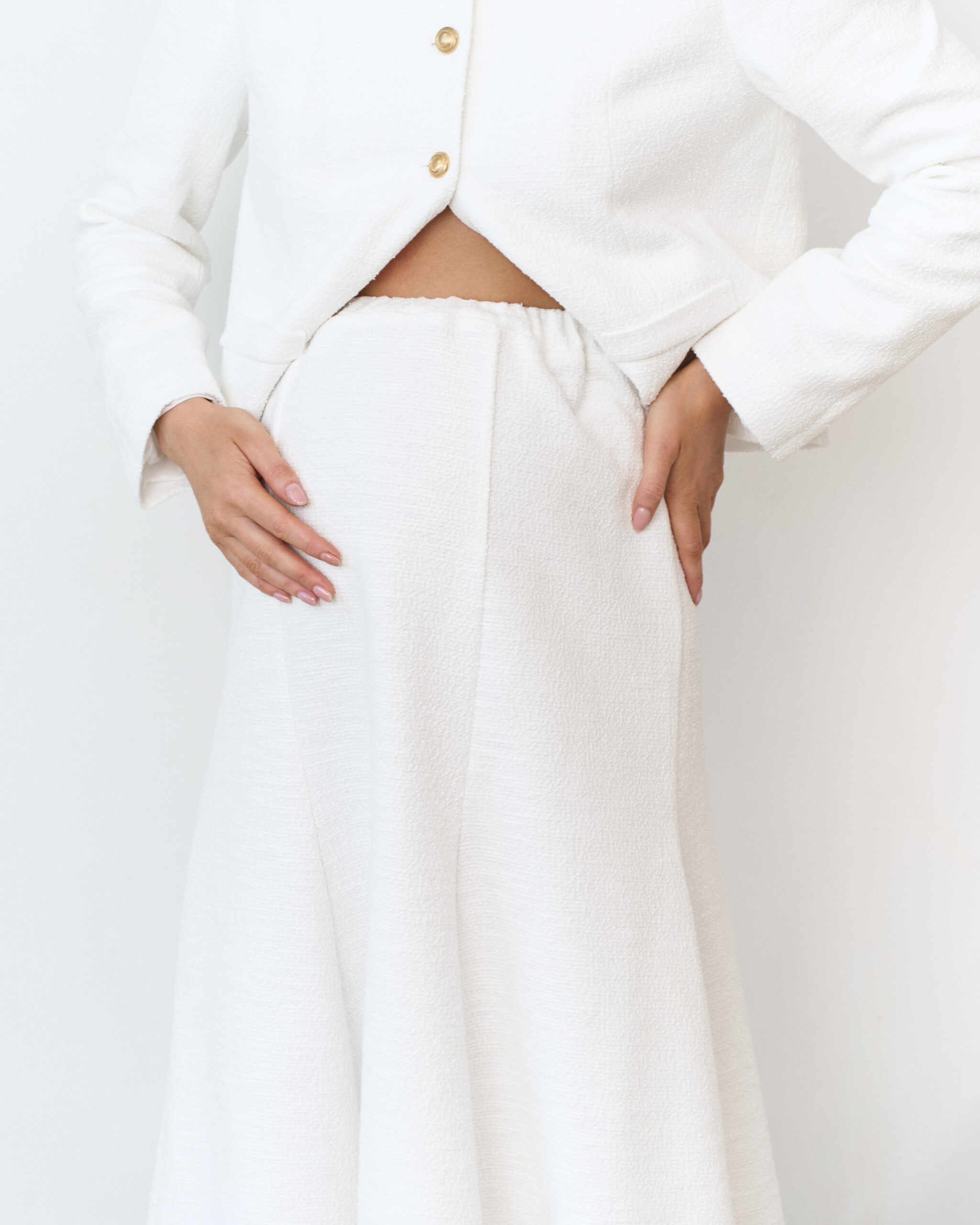 Трендовая твидовая юбка из плотной ткани в длине миди. Специально разработанный пояс позволит носить юбку на любом сроке беременности и после. В комплект к юбке вы можете приобрести жакет Gale