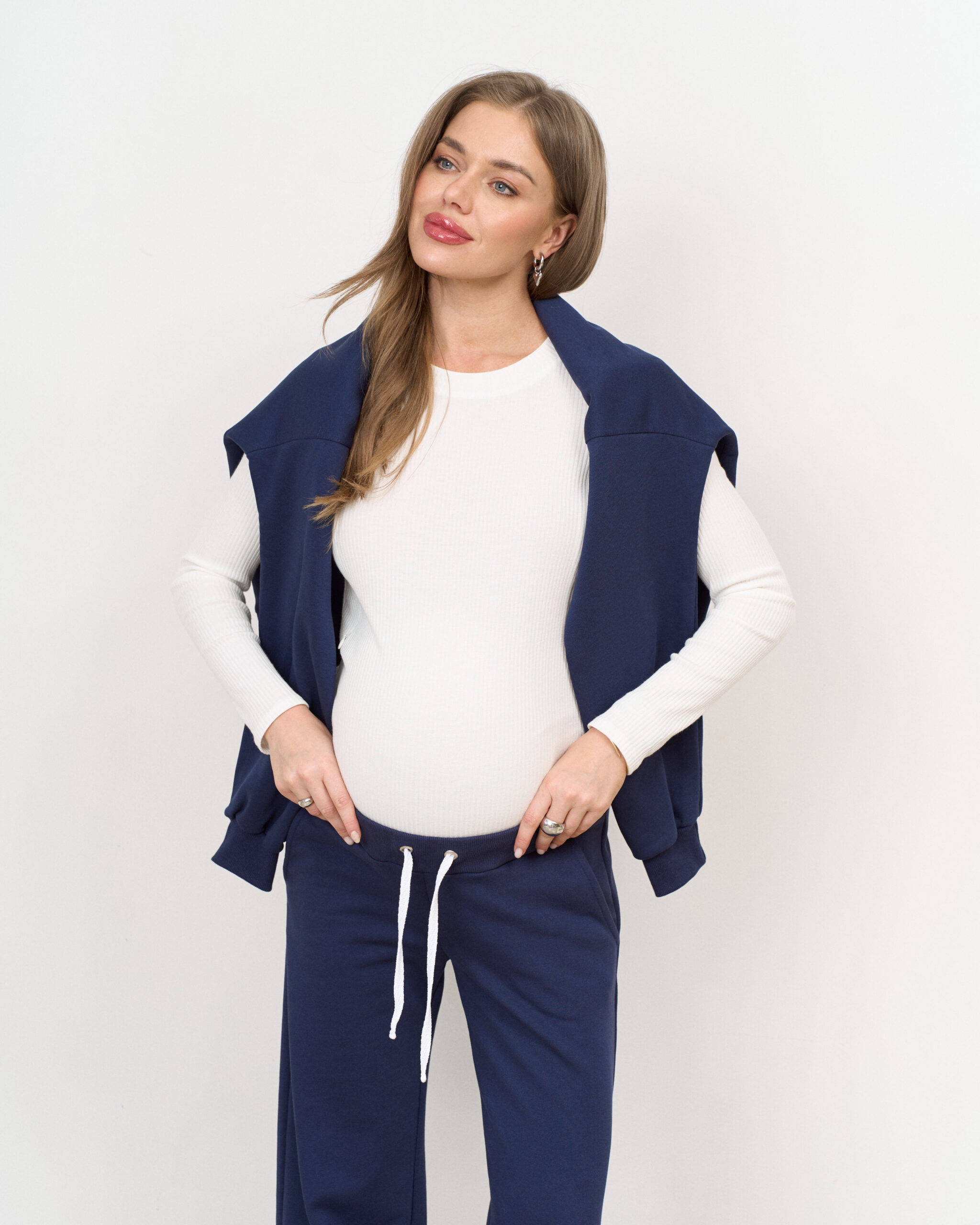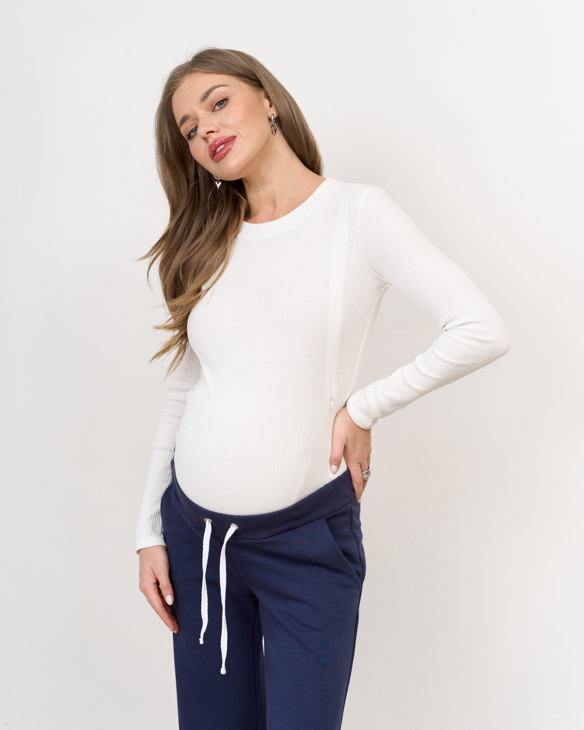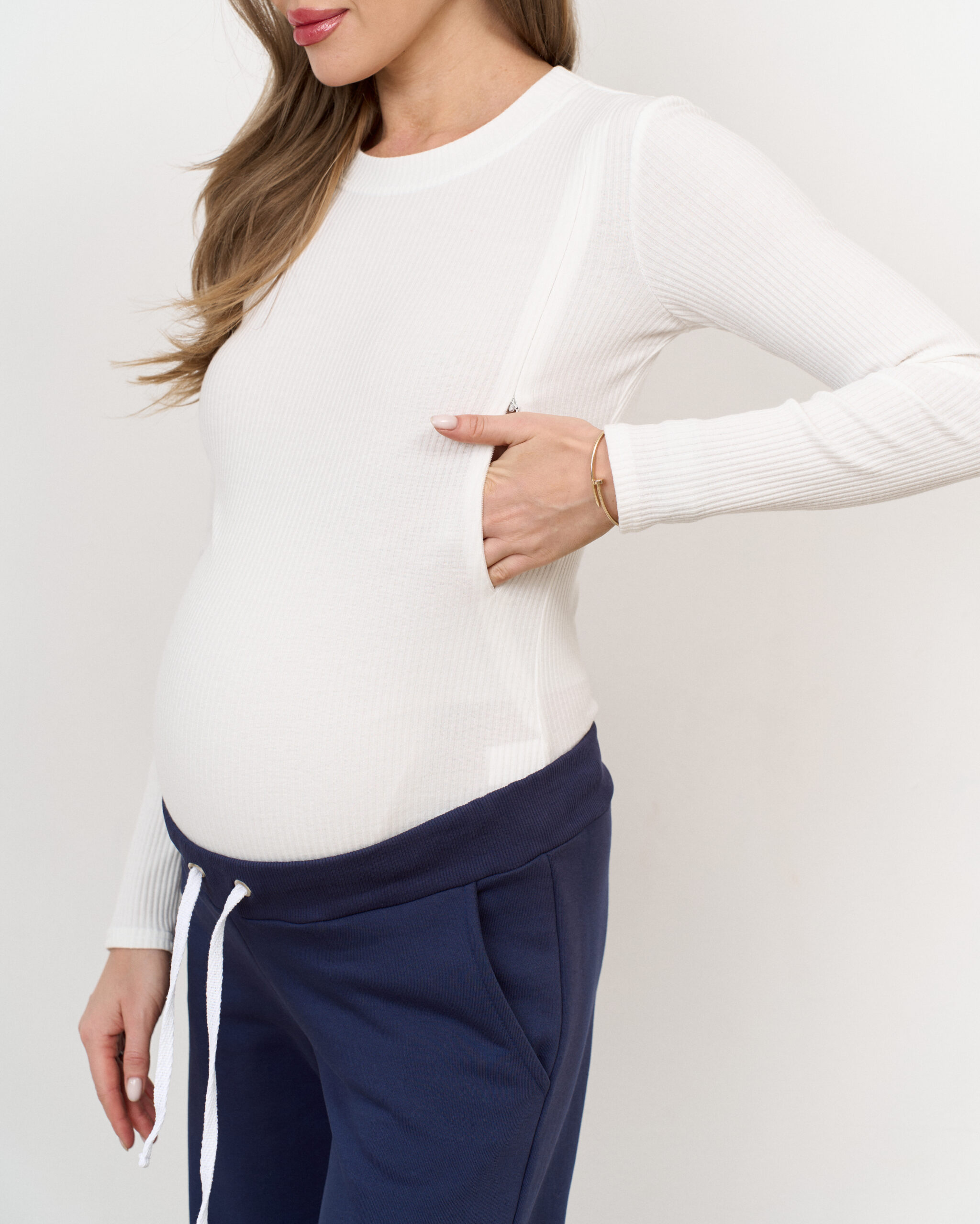 Комфортный и стильный боди из трикотажа в рубчик, прекрасно подходящий для фотосессий беременности. Также боди можно включать в повседневные образы, сочетая с юбками, джинсами и рубашками.