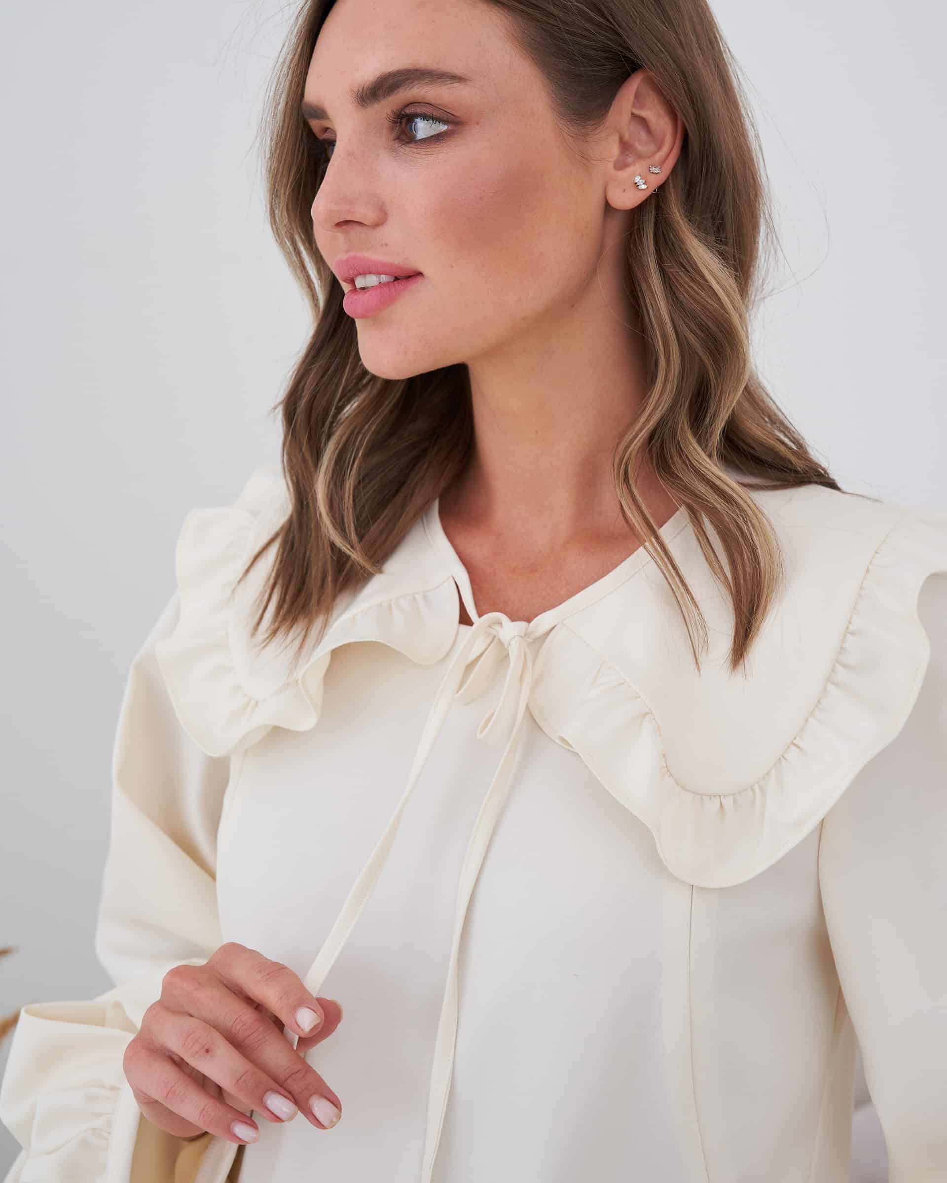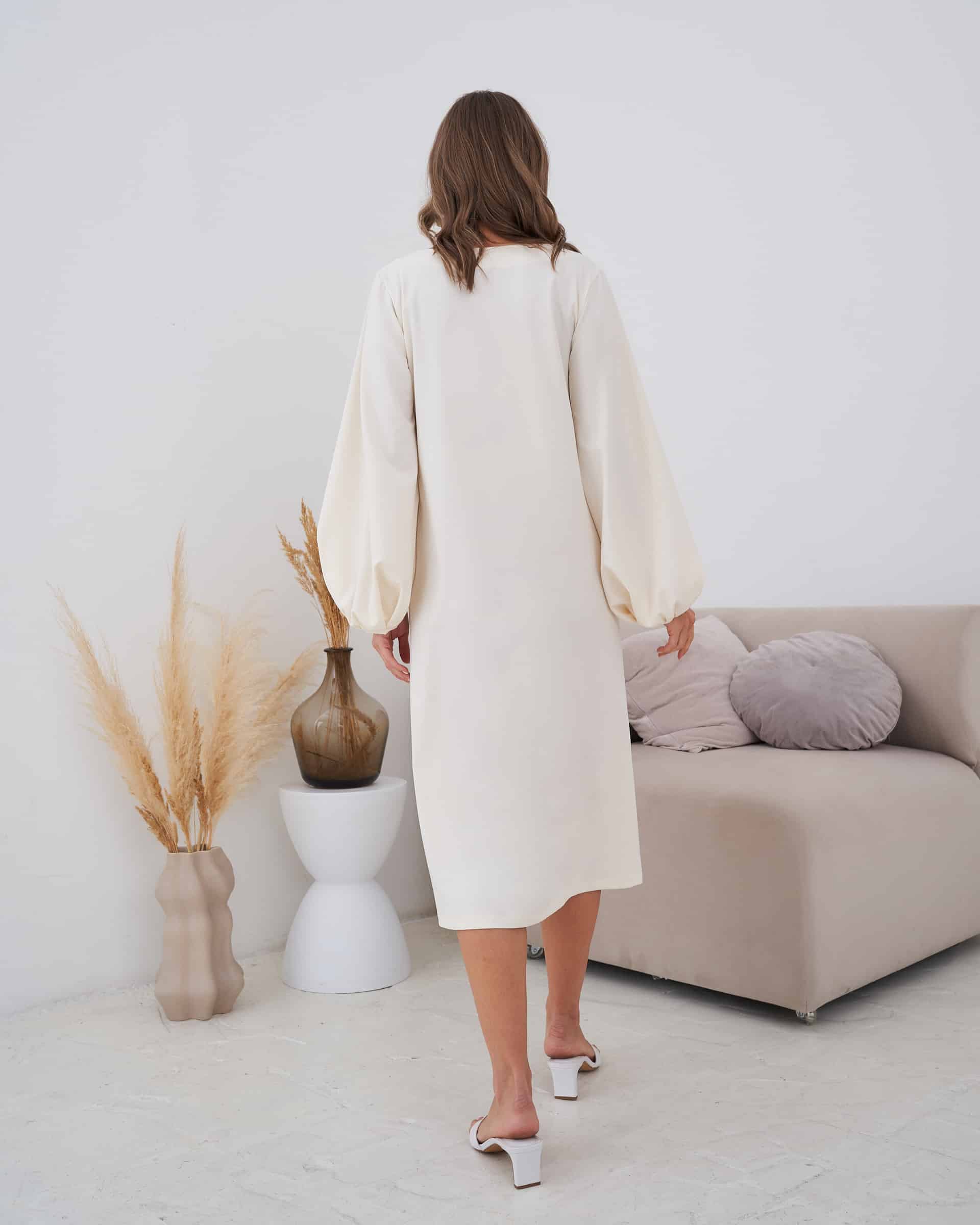Детали: рукава-буфы удлиненного кроя, круглый вырез, в комплекте съемный воротничок и пояс