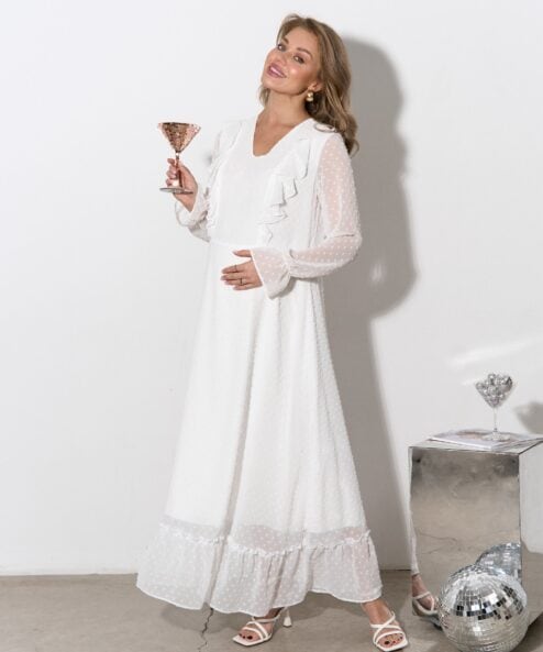 Молочное платье макси – модель свободного кроя с жаккардовым узором «горох» и оборками на груди и по низу.