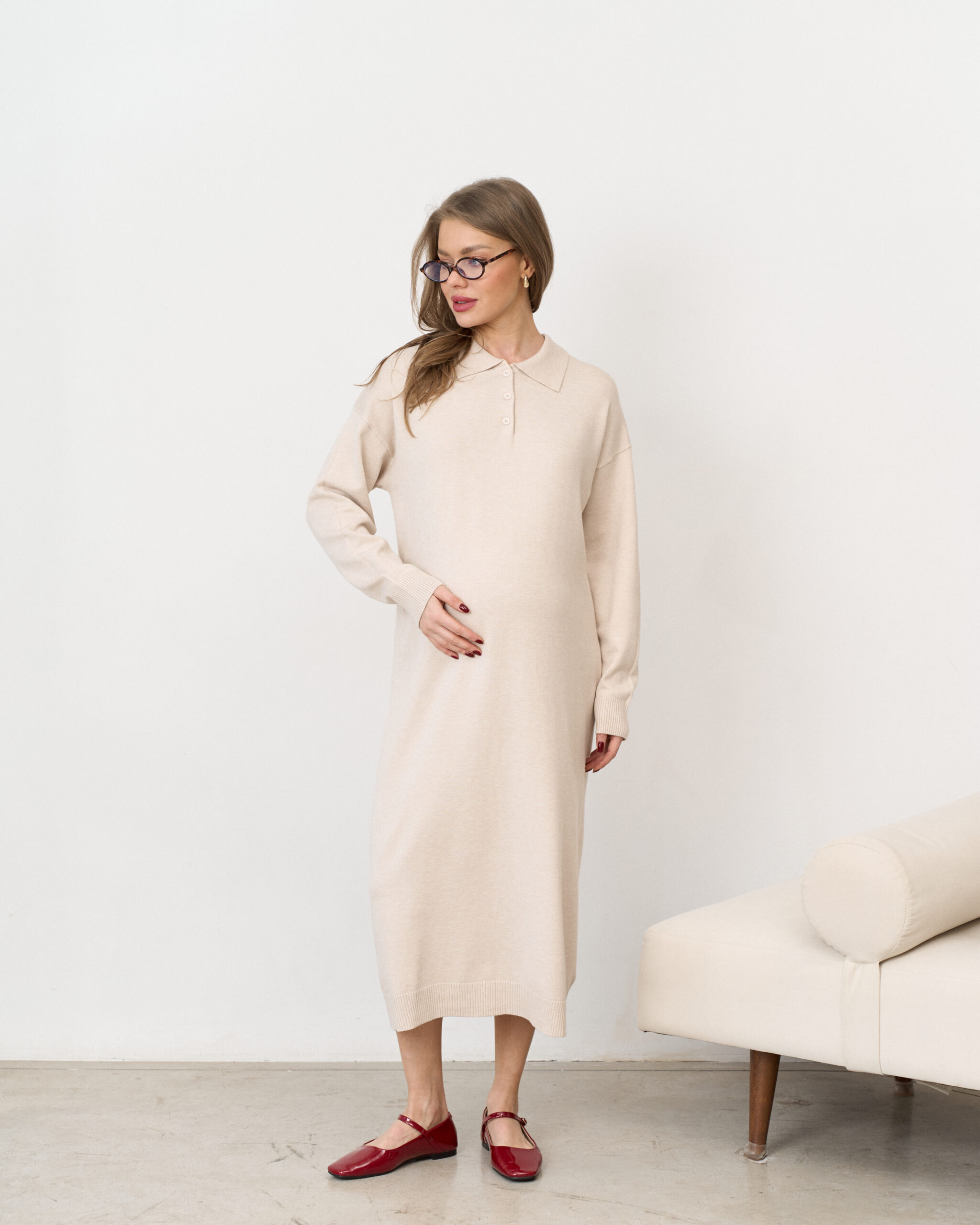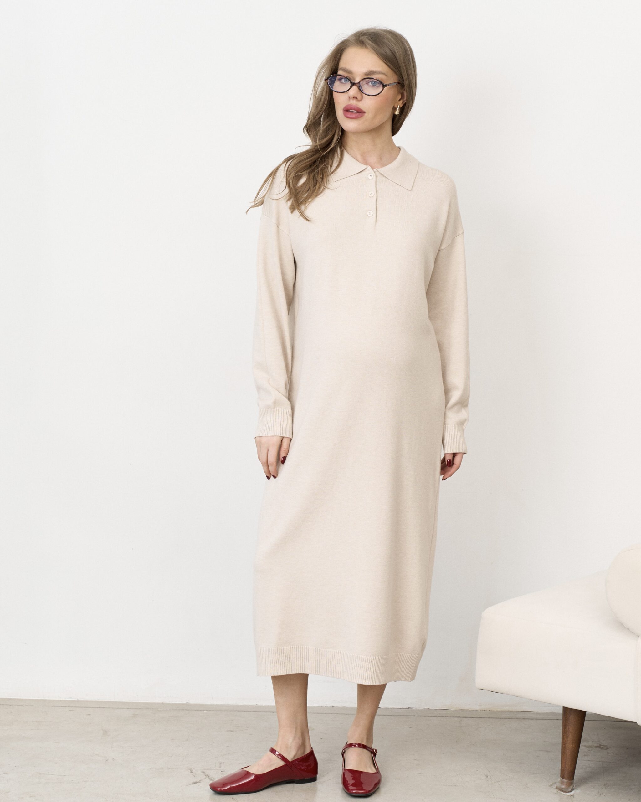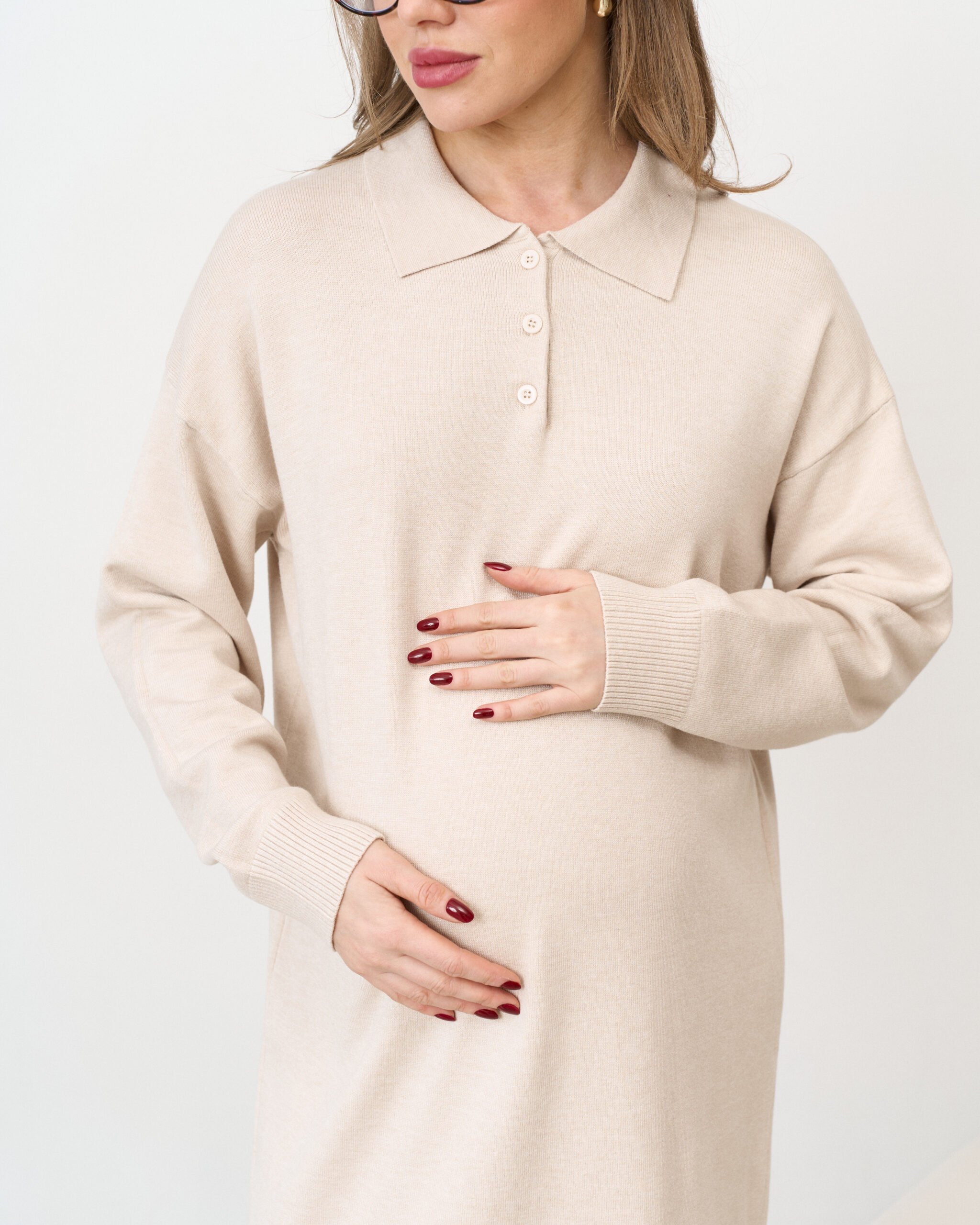 Молочное вязаное платье-поло для беременных Nova