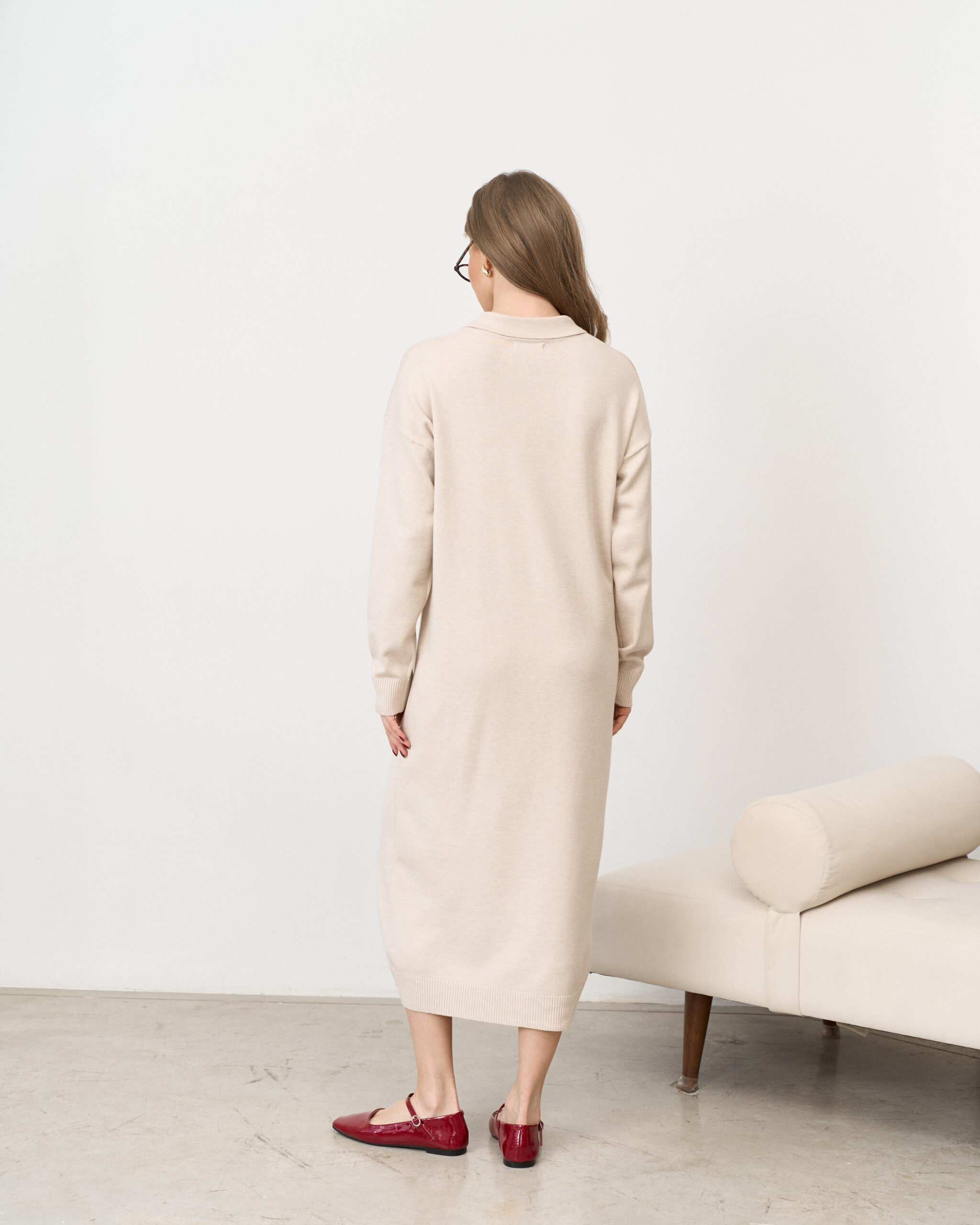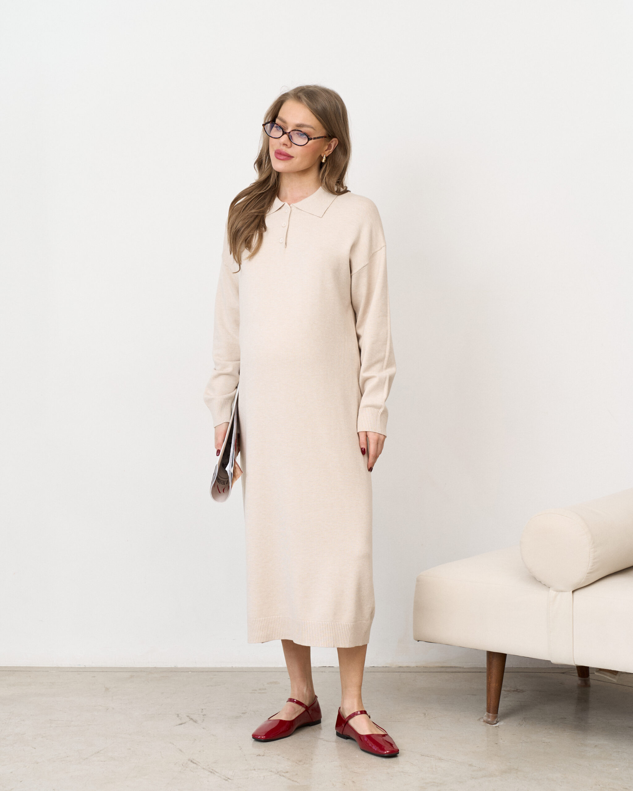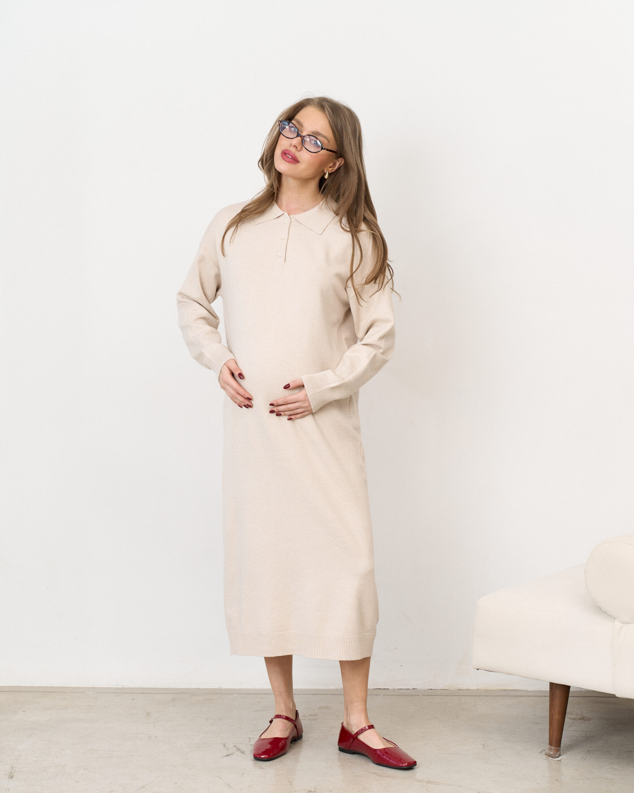 Молочное вязаное платье-поло для беременных Nova