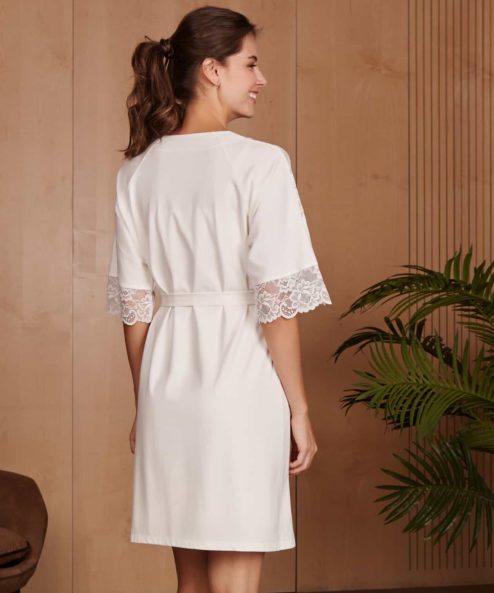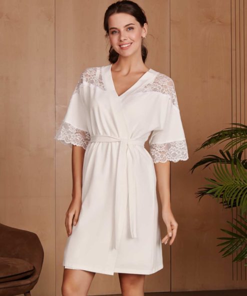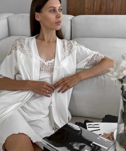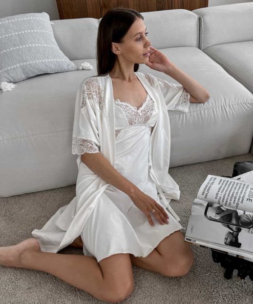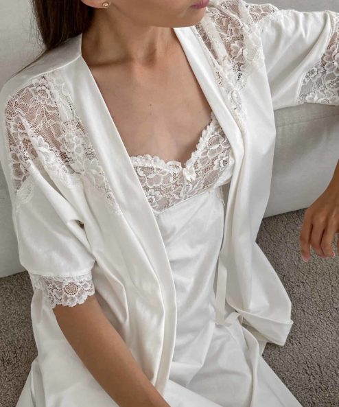 Роскошный набор для будущих и кормящим мам (комбинация и халат) из хлопка высочайшего качества «пенье» с добавлением лайкры. Отделан мягким кружевом на рукавах, плечах и сорочке. Сорочка имеет отстегивавшуюся на клипсе бретель для доступа к груди во время кормления.